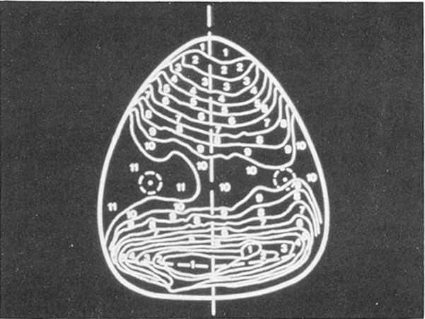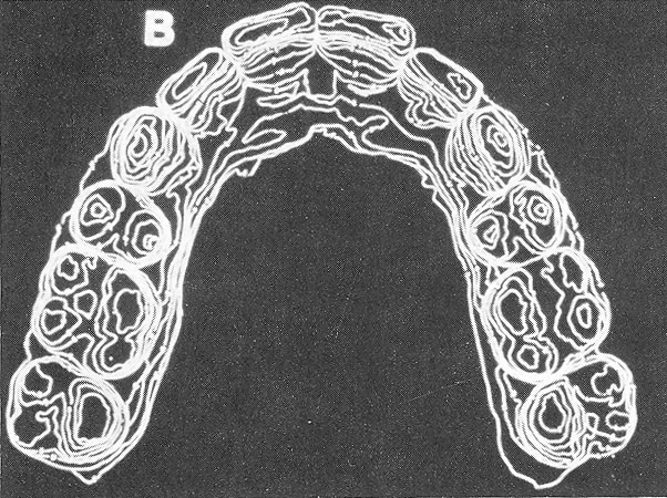 With the basic bracket design and the desired criteria in mind, it was necessary to determine if lingual tooth anatomy and intertooth relationships were amenable to a lingual edgewise straight-wire approach. To confirm the feasibility of such an approach, topographical contour maps of lingual anatomy were made from models of several finished orthodontic cases (Fig. 1). It became apparent that, with the exception of short clinical crowns, lingual morphology presented no great obstacles to establishing a straight archwire plane in both maxillary and mandibular arches. It was also observed that this plane was parallel to the occlusal plane in most cases.
