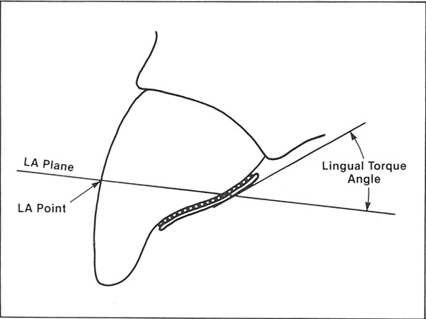 To accomplish this study, about 400 teeth closely resembling the anatomical form published by Wheeler6 were separated from study models, sectioned sagittally, mounted, and projected onto a screen, using an optical comparator a 10x magnification. Tracings of the labial and lingual profiles were made, and a line was drawn through the "LA-point" (the long axis midpoint of Andrews), representing the plane of the archwire, to define labial torque (Fig. 2). Lingual equivalent torque values were then calculated, studied statistically, and reduced to a set of average lingual torques.