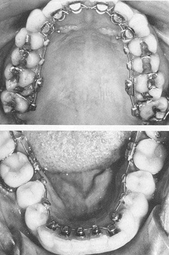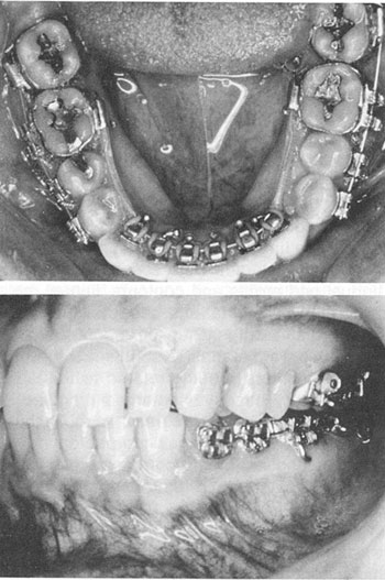 At this point in the appliance development, one of the greatest clinical problems was the difficulty in ligating the brackets. Patient acceptance appeared to be I better than expected, with tongue irritation and speech problems at a minimum. Starting in late 1979, all cases were bonded indirectly, and bracket retention was at least 90%. Initial cases were entirely lingual, including the second molars (Fig. 4). By December 1979, 40 patients were in treatment with this approach.