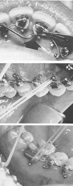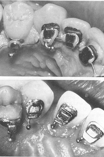The Lingual Task Force was established in December 1980 to provide additional input on design considerations and to expand the treatment modalities. Ball hooks were added to all lingual brackets at this time. Ball hooks, while aiding greatly in placing elastic ligatures and elastics (Fig. 8), can cause gingival hyperplasia.