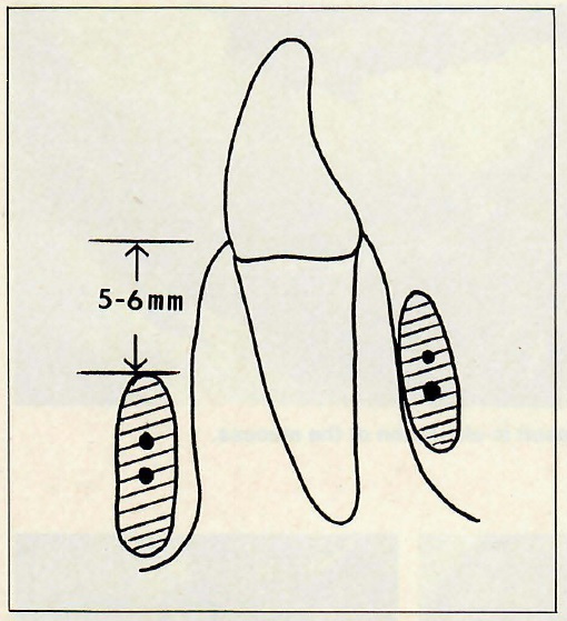 McNamara2,3 has shown the proper position of the inferior edge of the labial pads to be 10-14mm below the free gingival margin of the lower incisors. Another way to decribe their position is that the superior border of the pad should be 5-6mm below the gingival margin1 (Fig. 11). Labial pads are not lip bumpers. Lip bumpers act in the area of the orbicularis oris, while labial pads act on the mentalis muscle. This should be borne in mind during their fabrication and clinical adjustment.