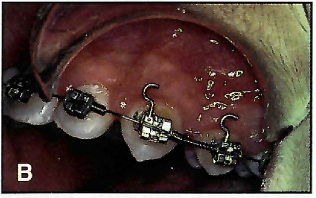 This time-consuming process can be avoided simply by placing several 1 1/2-2mm lengths of closed-coil spring, of the same wire dimension and lumen as the open-coil spring, over the base archwire in the interbracket space adjacent to the tooth being moved (Fig. A). The open-coil spring is reactivated by removing a single ligature tie and then sliding a section of closed-coil spring across the bracket, thus recompressing the open coil (Fig. B). The procedure can be repeated as many times as necessary by sliding additional lengths of closedcoil spring across the bracket, until adequate space is obtained. There is no need to remove the archwire (Fig. C).