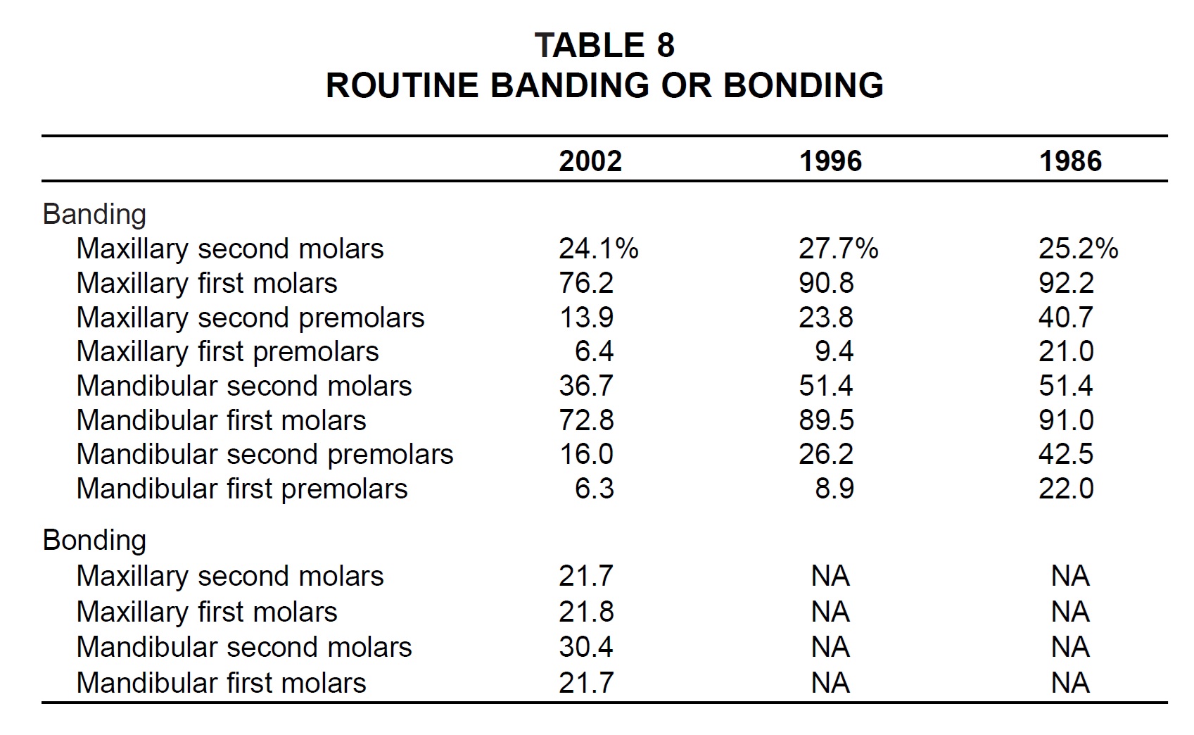 The only teeth that were routinely banded by a majority of orthodontists in 2002 were second molars, but all molars and premolars were banded less routinely than in the past (Table 8). Mandibular second molars were somewhat more likely to be bonded than other molars, but were still bonded routinely by less than one-third of the respondents.