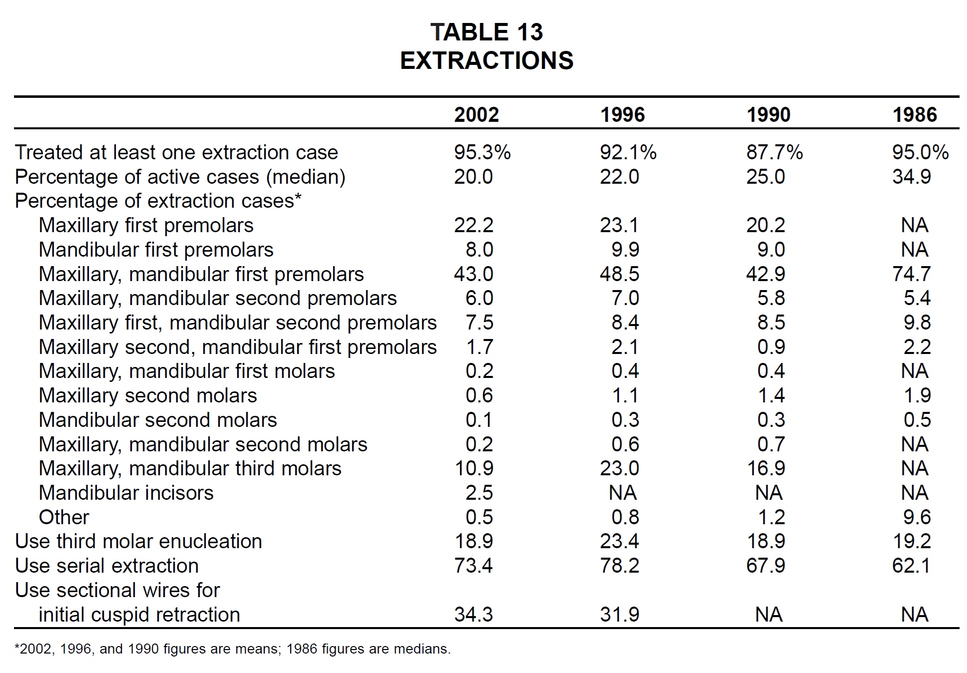 Although almost all respondents continued to treat at least some cases with extractions, the median percentage of extraction cases reached an all-time low of 20% (Table 13). The most common extraction prescription remained four first premolars, followed by other combinations of first and second premolars.