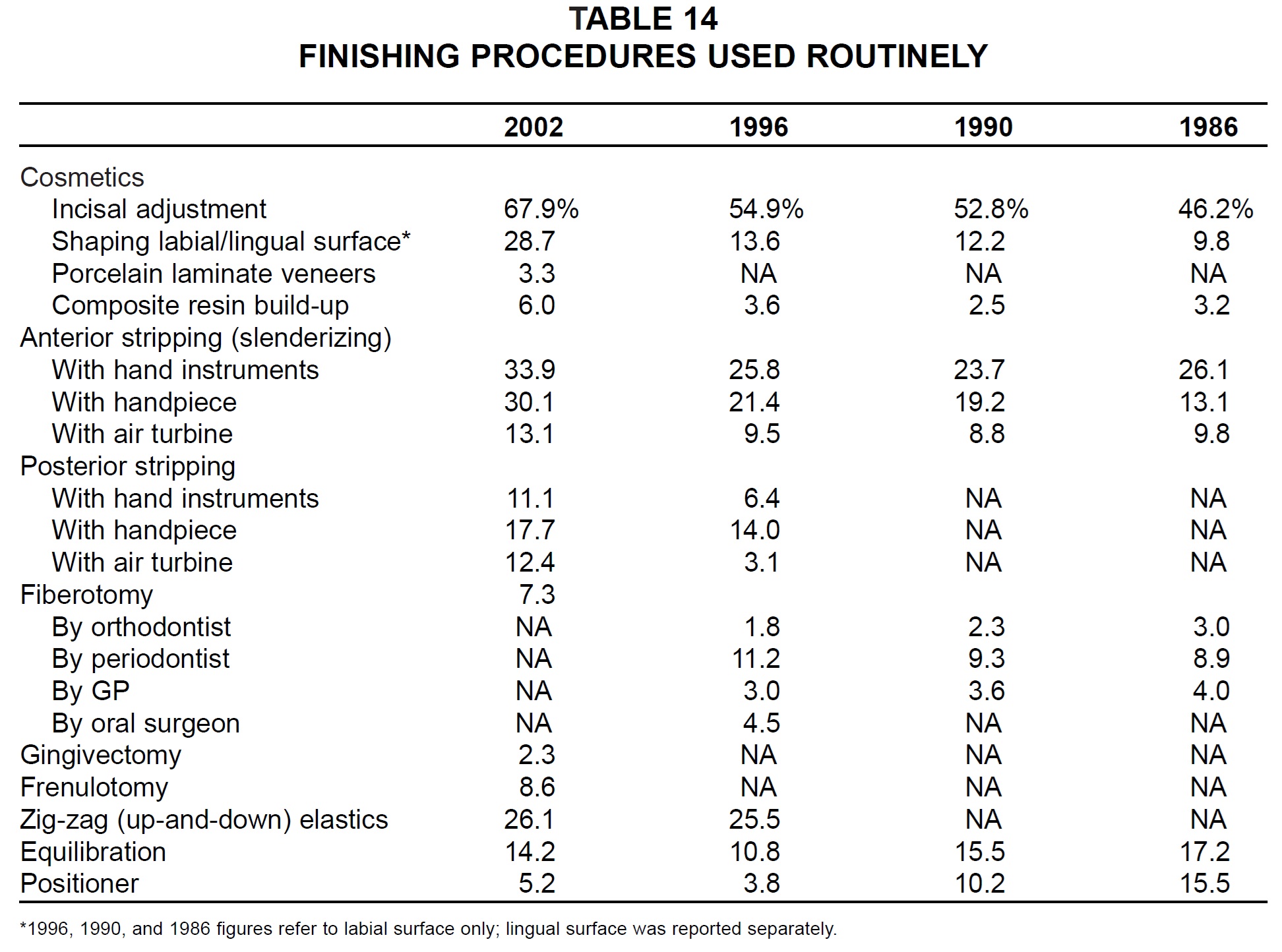 The cosmetic finishing procedures surveyed continued to reflect an upward trend in routine use (Table 14). More than two-thirds of the respondents in 2002 routinely performed incisal adjustments and some method of anterior stripping. More than one-third routinely performed posterior stripping, and about one-fourth routinely used zig-zag elastics.