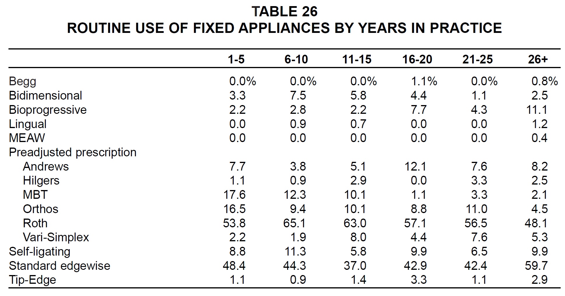 Respondents who had been in practice the longest were the most likely to use Bioprogressive, lingual, and standard edgewise appliances (Table 26). Among the preadjusted appliance prescriptions, MBT and Orthos were more popular among the newer practices, and the Roth prescription among those who had been in practice for six to 15 years.