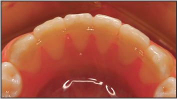 Both the retainer material and the composite appear to be critical in successful bonding of lingual retainers.7 Flexible wires have the highest failure rate among common materials, with many bond failures due to fracture of the wires themselves.7,8 A reinforced polyethylene fiber material is just as difficult to cover completely with resin. Using light-cured, color-reactivating composite (Tetric Flow Chroma**) rather than a tooth-colored composite gives the clinician a better opportunity to monitor cracks, failures, and inadequate interface between the adhesive and the tooth surface. Another advantage of this flowable resin is that there is no need for finishing or polishing, which saves chairtime.9-12