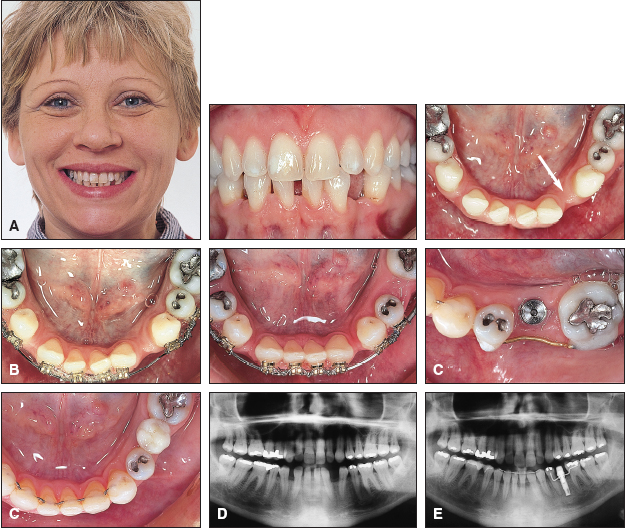 Fig. 18 A. 41-year-old female patient with agenesis of both mandibular central incisors, multiple spaces, thin periodontal tissues, and prominent root topography. Alveolar ridge was too thin labiolingually to allow implant placement in anterior region (arrow). B. Orthodontic movement used for implant site development mesial to mandibular left first molar. C. Wide area of bone on tension side provided ample space for titanium implant. Panoramic radiographs taken before (D) and after (E) treatment show placement of implant in area previously occupied by left second premolar. (Reprinted by permission.41)