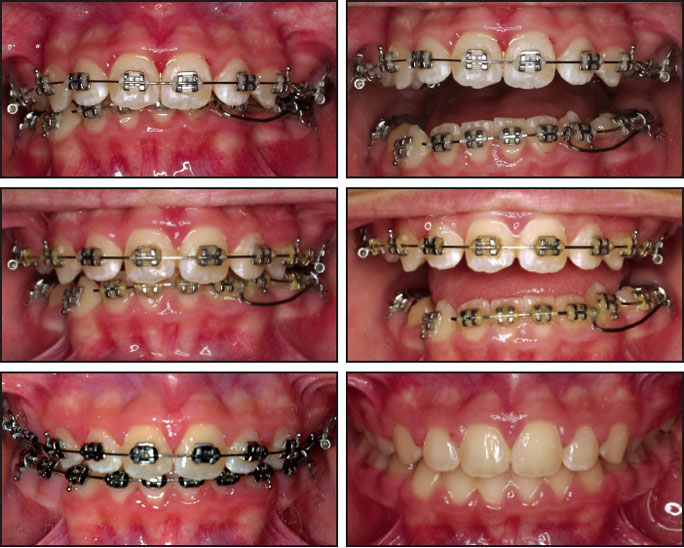 When the lower arch was almost completely leveled, a continuous .017" x .025" CNA archwire was placed in the lower arch, and a vertical seating elastic was used on the right side to extrude the lower canine and premolar and finish the correction of the incisal cant (Fig. 7). An .017" x .025" stainless steel wire was placed in the upper arch to minimize any extrusion of the maxillary teeth. Detailing was completed with esthetic wire bends (Fig. 8).