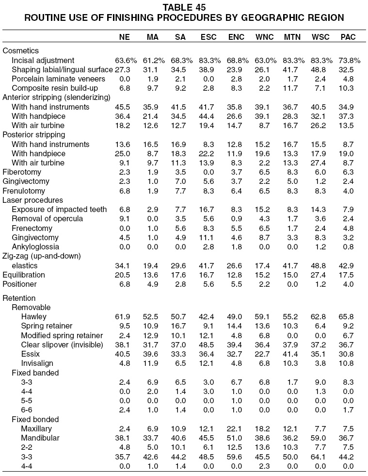 The most routine use of cosmetic procedures appeared to be in the West South Central and Mountain regions (Table 45). No geographic pattern emerged among other finishing techniques, except that laser procedures were most commonly used in the East South Central region, and zig-zag elastics and equilibration in the West South Central region. Hawley retainers were used most routinely in the Pacific region; spring retainers in the South Atlantic region; modified spring retainers in the Middle Atlantic region; clear slipover and Invisalign retainers in the East South Central region; and Essix retainers in the Mountain region. Fixed bonded retainers seemed to be most popular among West South Central orthodontists.