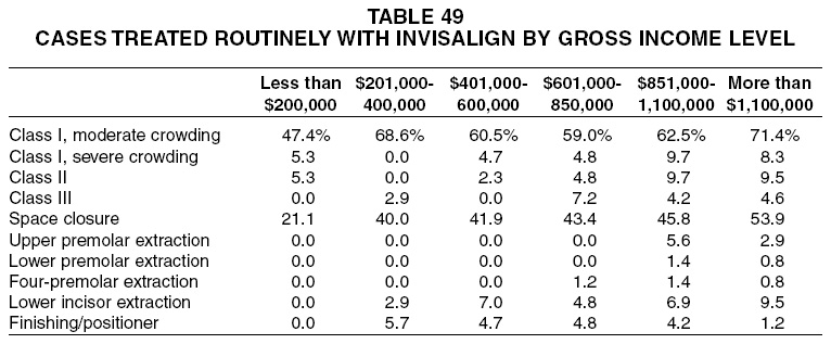 Routine Invisalign usage generally increased with gross income for every type of treatment surveyed (Table 49). Still, only Class I cases with moderate crowding and space-closure cases were treated routinely by as many as 10% of the respondents in any group.