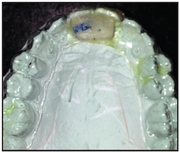 Fig. 2 Cold-cure acrylic used to form biteplane between upper central incisors.