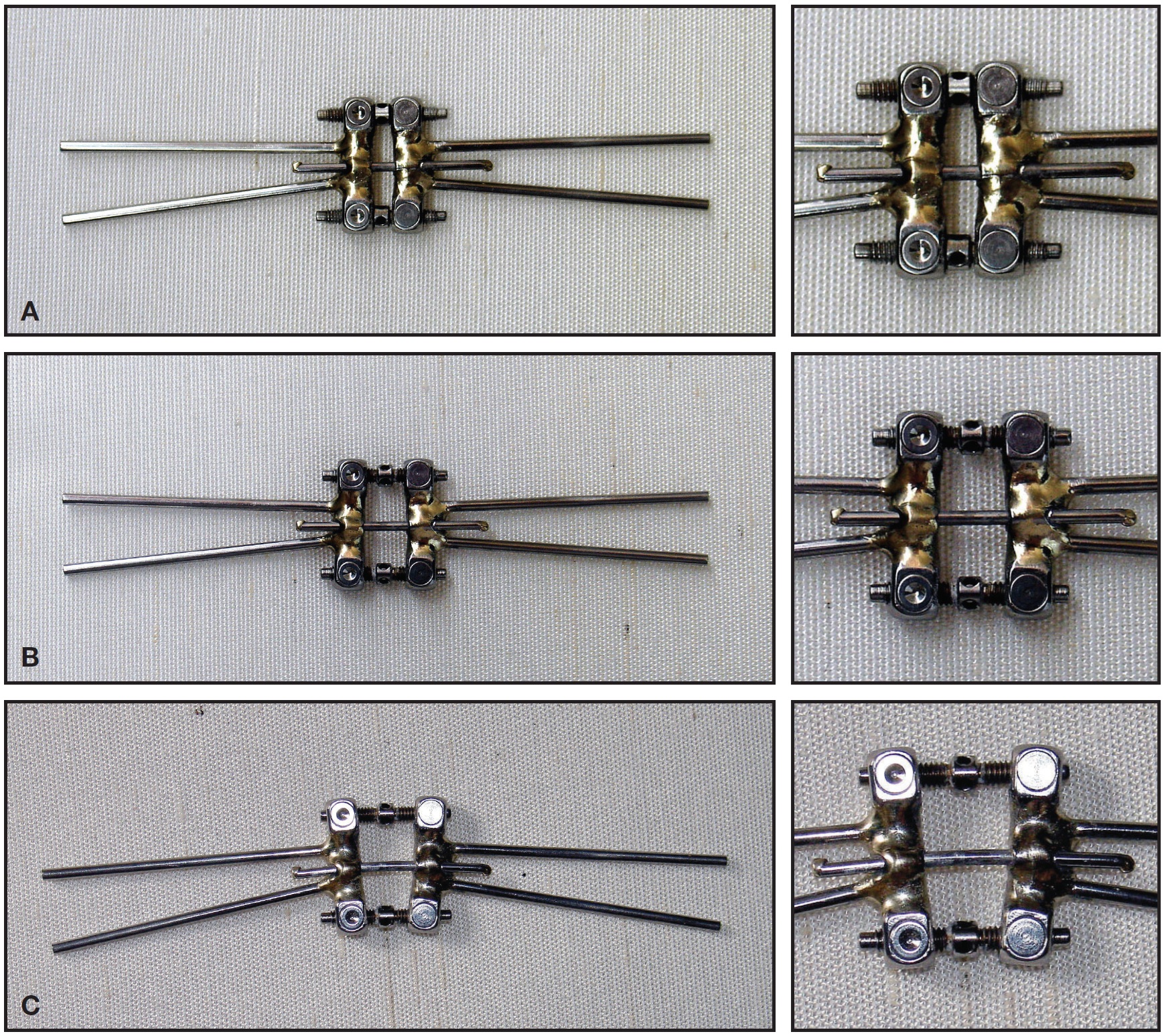 Fig. 1 Expansion screw with differential opening (EDO). A. Before activation. B. After activation of both anterior and posterior screws. C. Additional activation of anterior screw, producing differential expansion.