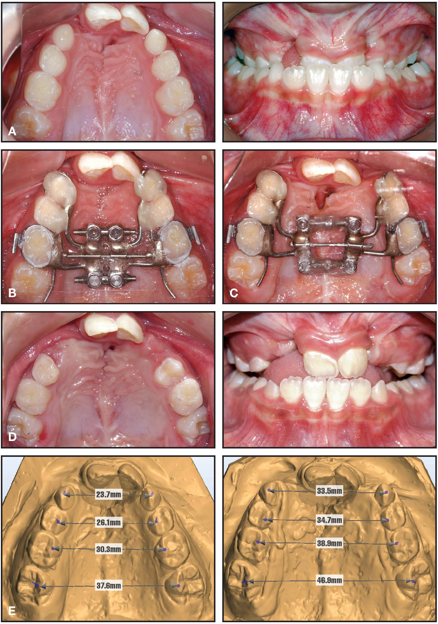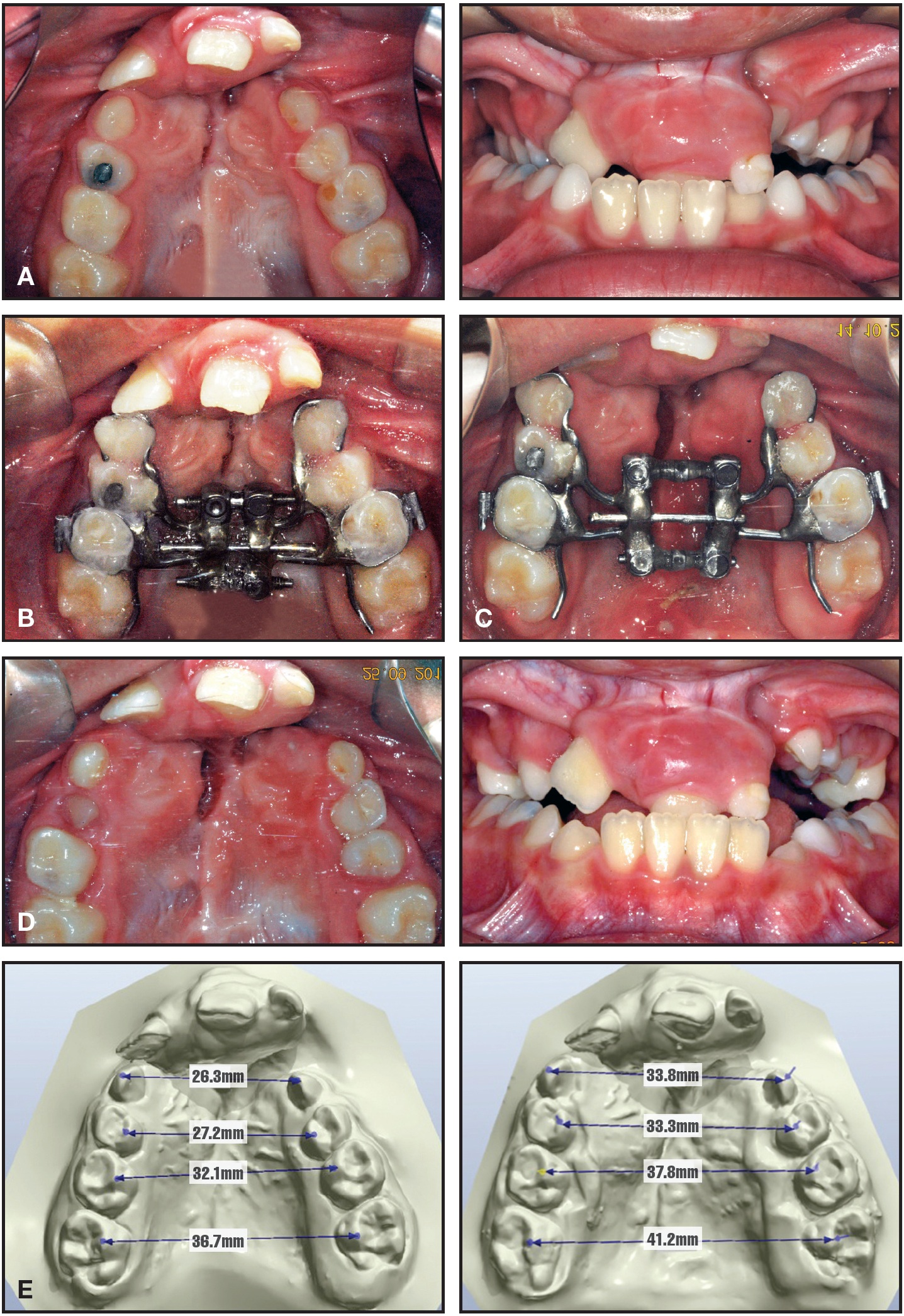 Fig. 3 Case 1. A. 9-year-old female patient with complete bilateral cleft lip and palate. B. Placement of EDO. C. After 10 days of activation of both screws and additional two days of anterior-only activation. D. Six months later, after removal of expander, exfoliation of maxillary deciduous canines, closure of oronasal fistula, and alveolar bone graft. E. Comparison of palatal widths before and after expansion.