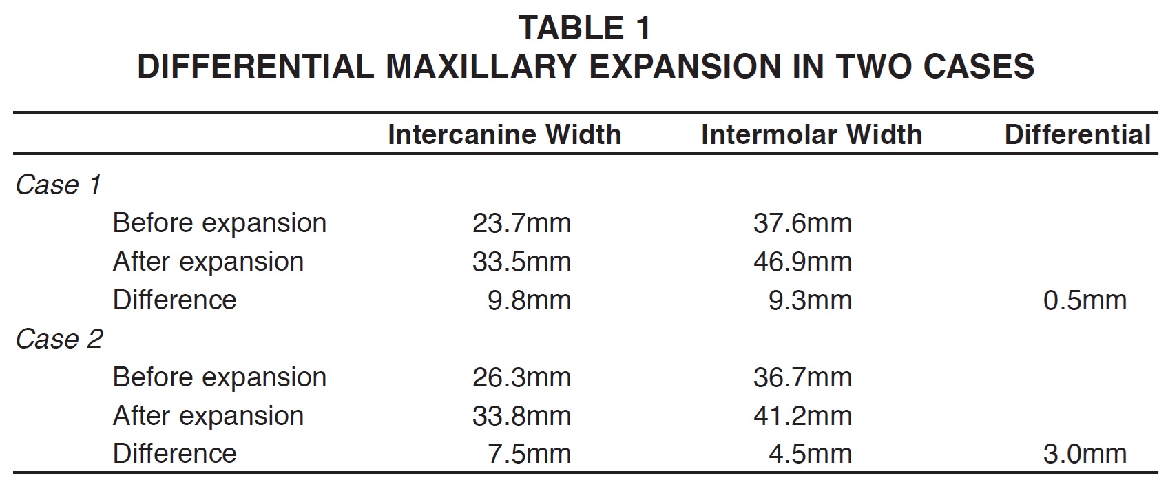 Many attempts have been made to produce greater expansion in the maxillary canine regions of CLP patients by changing the design of conventional expanders.8-11 Although a few appliances, including the Quad Helix* and the "W" arch, have been successful,8 conventional devices for rapid maxillary expansion (RME) are limited to one direction, along the axis of the expansion screw, and thus cannot provide differential expansion. A modification such as a fan-shape design will expand only the intercanine distance, not the intermolar distance.9,11