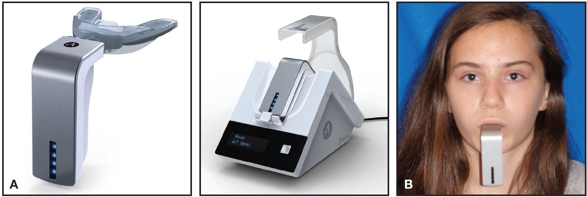 Fig. 1 A. AcceleDent* activator and charging port (images used by permission of OrthoAccel Technologies). B. AcceleDent device in use.
