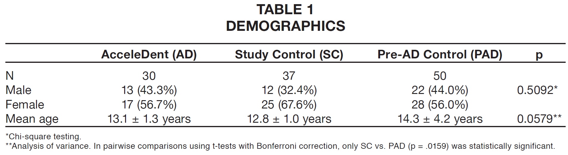 Thirty patients were enrolled in the AcceleDent vibration (AD) group (mean age = 13.1 years) and 37 in the study control (SC) group (mean age = 12.8 years). The pre-AD (PAD) control group comprised 50 Class II patients (mean age = 14.3 years) who were treated prior to the initiation of a separate prospective examination of the effects of vibration on molar distalization, whose results will be published later.
