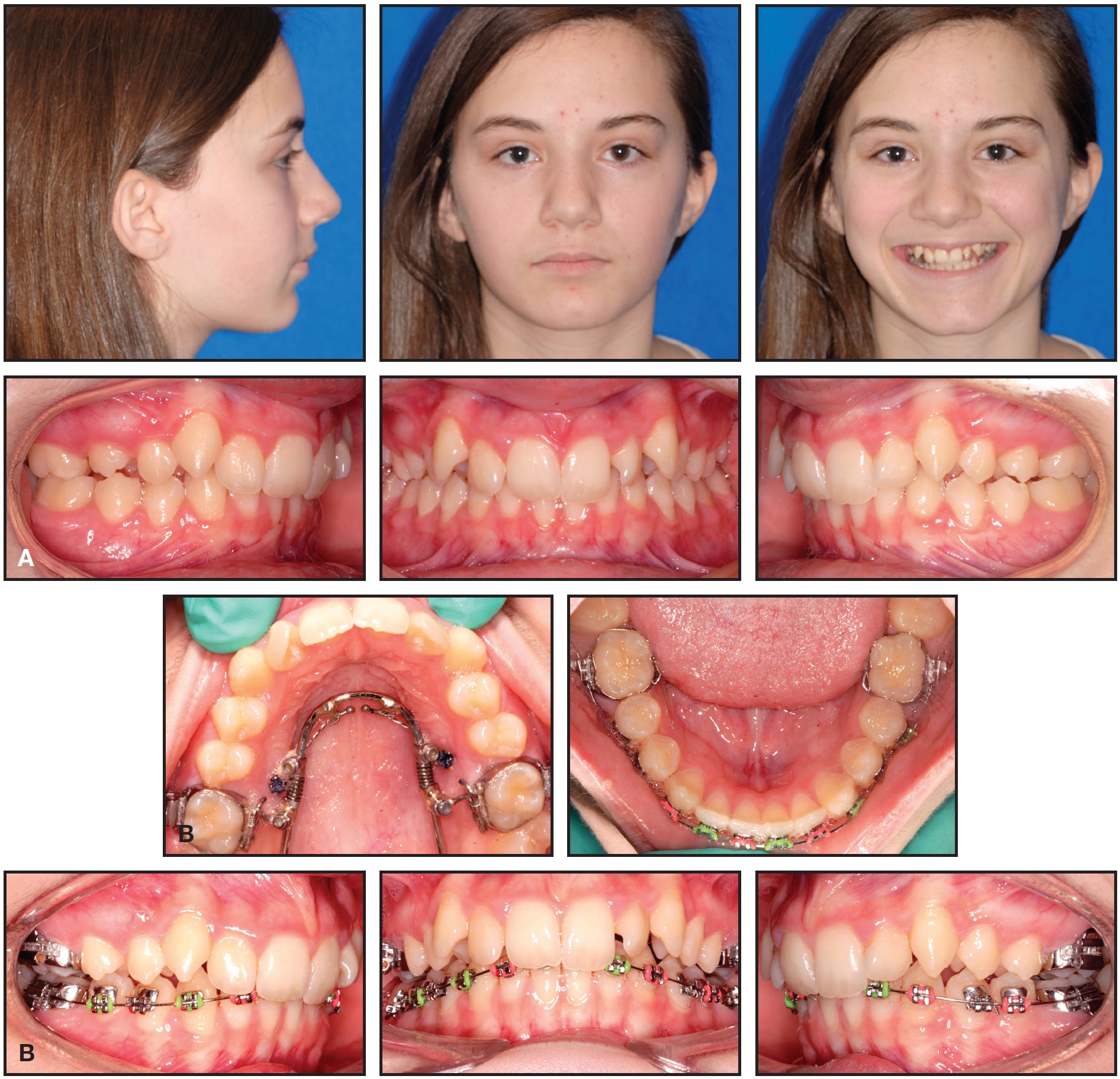 Fig. 2 A. 14-year-old female Class II patient before treatment. B. After placement of Horseshoe Jet** maxillary molar distalizer and preadjusted Butterfly System*** mandibular brackets with initial .016" nickel titanium archwire. Patient was scheduled for appointments every four weeks and instructed to use AcceleDent vibration unit for 20 minutes per day.