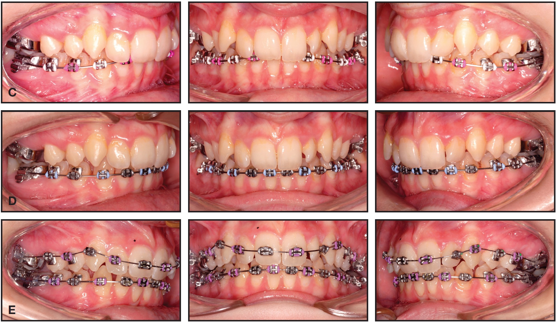 Fig. 2 (cont.) C. Mandibular .019" × .025" nickel titanium archwire inserted after 95 days of treatment, marking end of alignment phase. D. Mandibular .019" × .025" stainless steel archwire inserted after six months of treatment, marking completion of leveling. E. Maxillary brackets bonded and second molars banded after seven months of treatment.