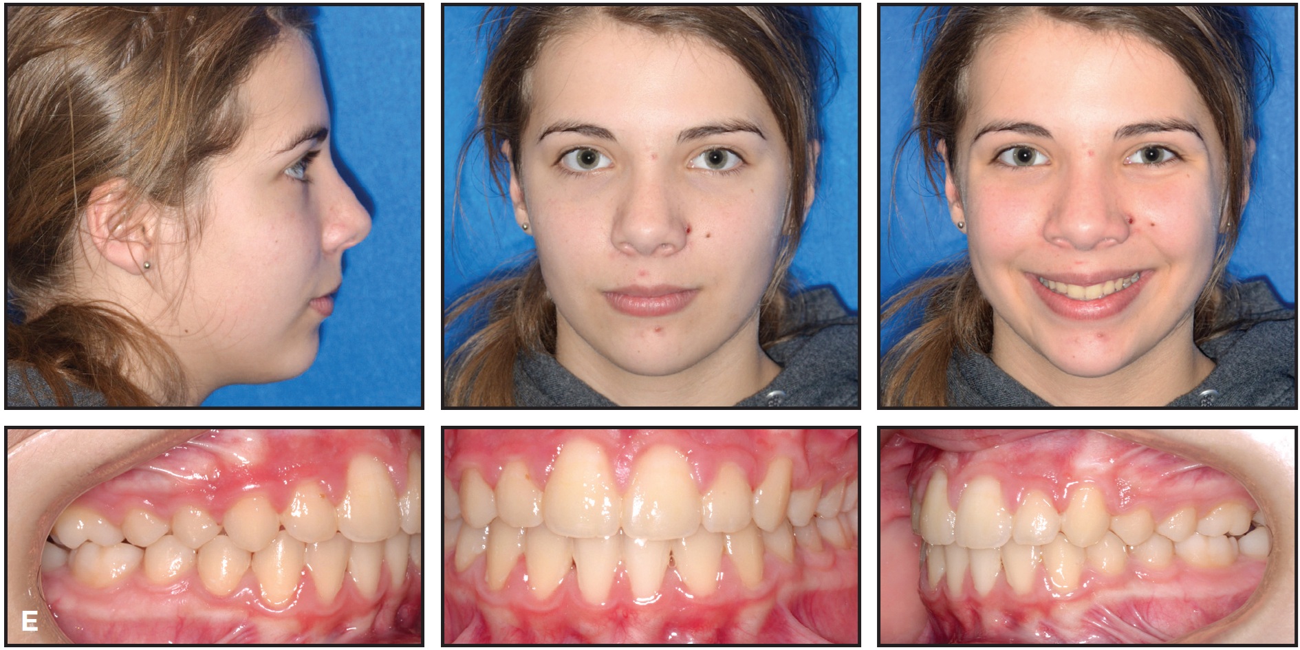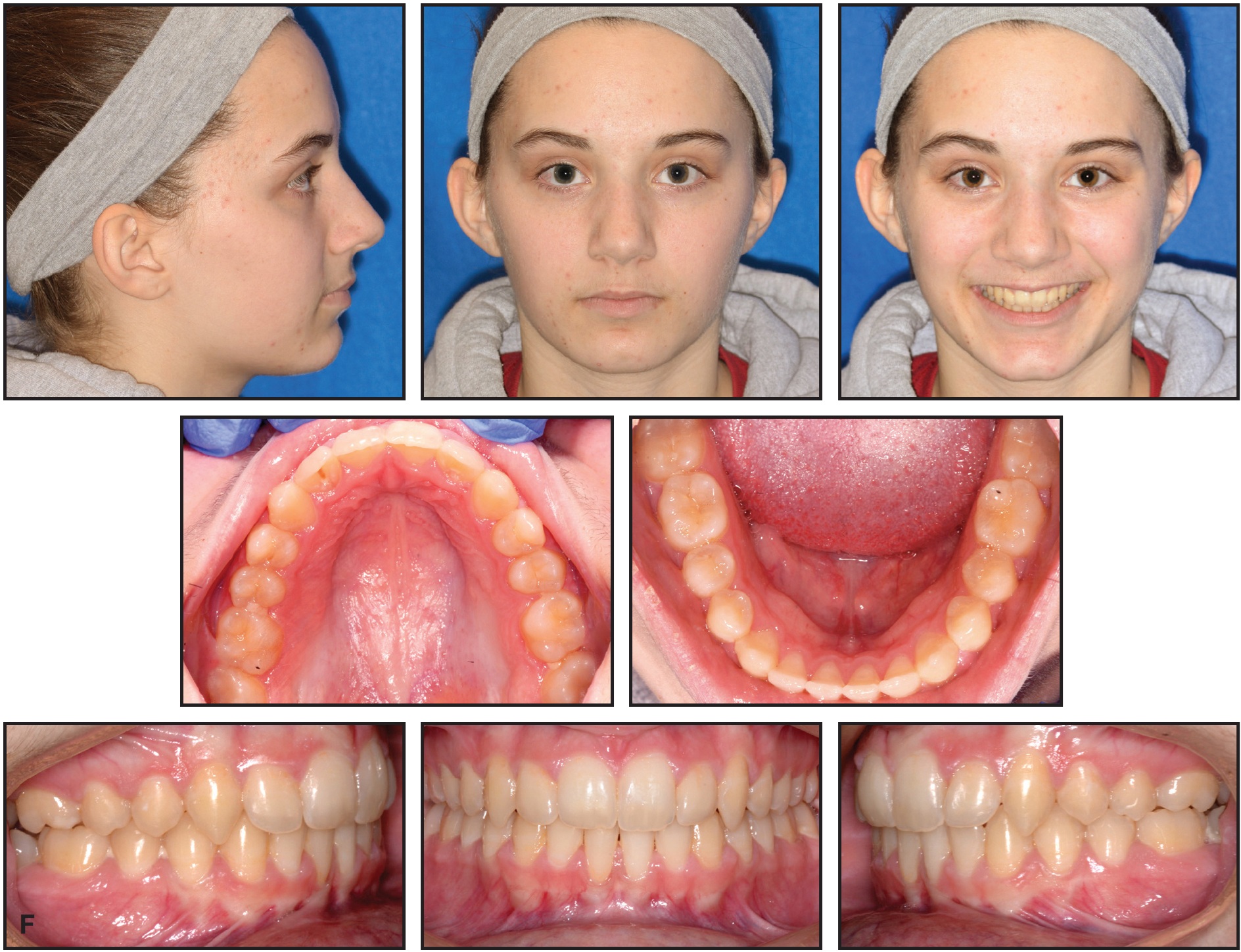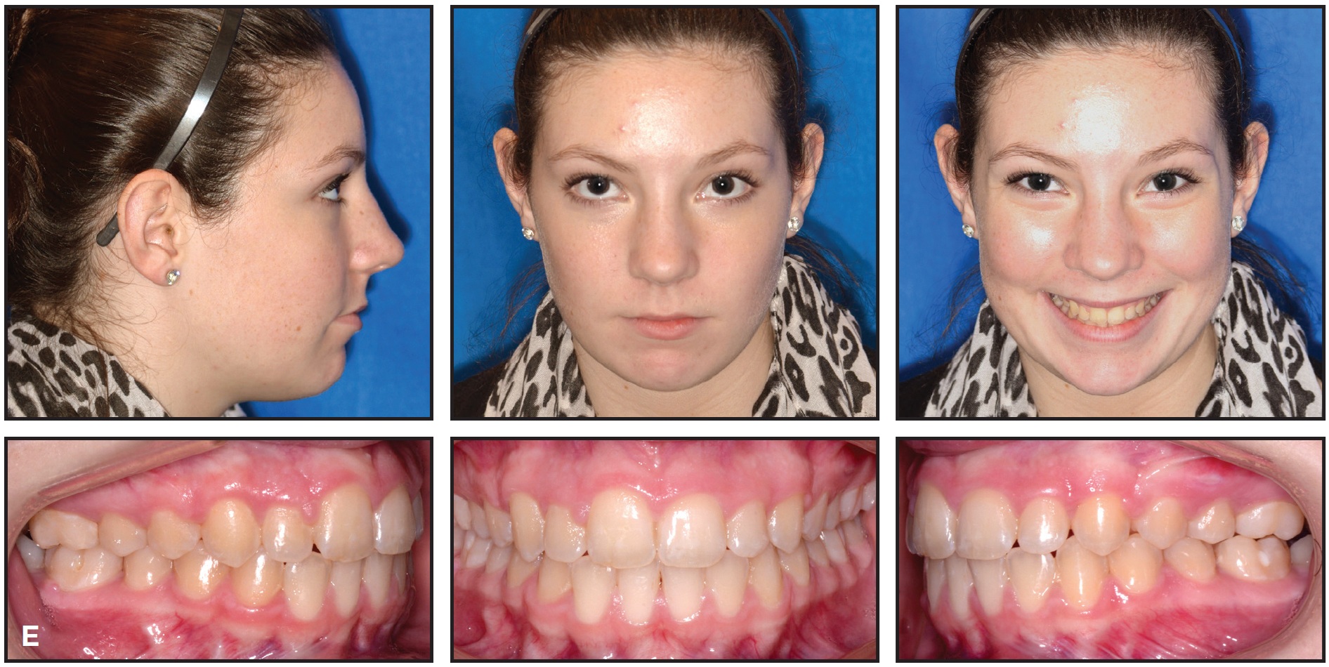 Each patient presented with a half-to-fullstep Class II molar relationship and mild-to-moderate crowding. The nonextraction treatment involved a miniscrew-supported Horseshoe Jet** maxillary molar distalizer20 and a preadjusted .022" Butterfly System***21 mandibular appliance (Figs. 2AB, 2C-E, 2F, 3AD, 3E, 4A-E, 4E.