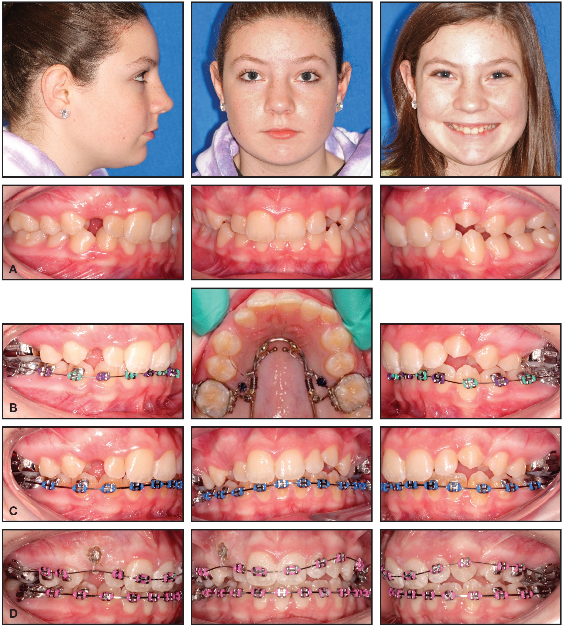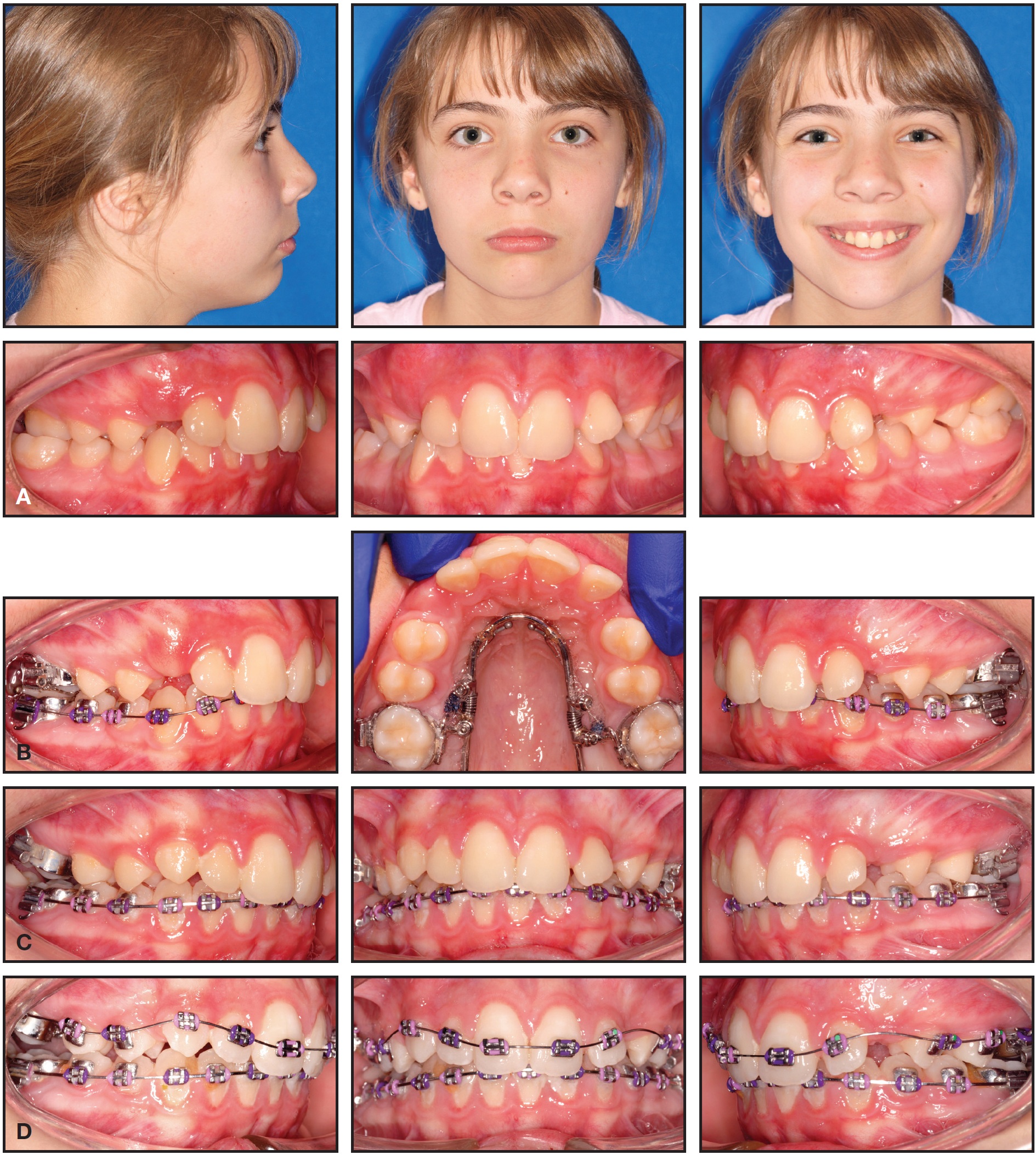 Fig. 3 A. 13-year-old female Class II patient before treatment. B. After insertion of maxillary Horseshoe Jet, bonding of mandibular Butterfly System brackets, and delivery of AcceleDent. C. After 55 days of alignment and 83 days of leveling. D. Maxillary brackets bonded and right canine exposed with diode laser after nine months of treatment.