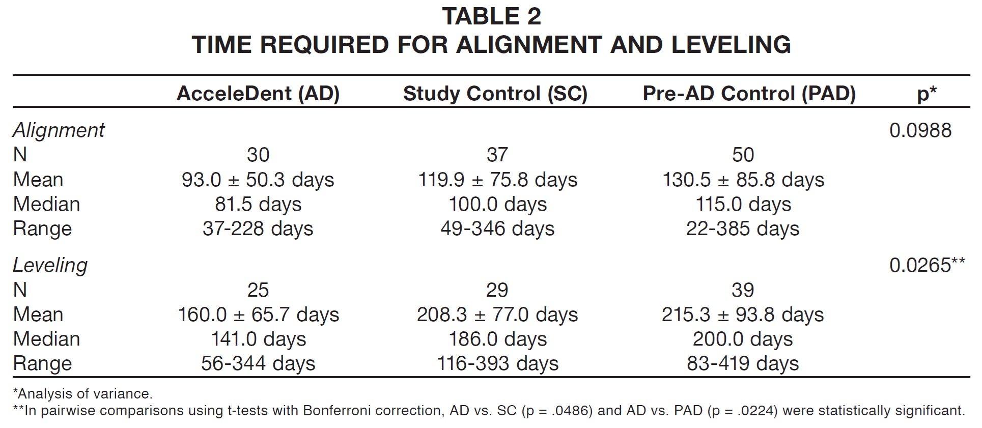 Although the PAD group was older on average than the other two samples, no statistically significant differences in age were found (Table 1). Likewise, there were no significant differences among the three groups in terms of gender. The average time period needed to attain alignment of the mandibular dentition (Table 2) was shorter in the AD group (93 days) than in either the SC group (120 days) or the PAD control group (131 days). The .017" x .025" archwire was placed in the AD patients about 27 days earlier (29% faster) on average than in the SC patients and 38 days earlier (40% faster) than in the PAD subjects. It is important to note that these differences, while clinically relevant, were not statistically significant.