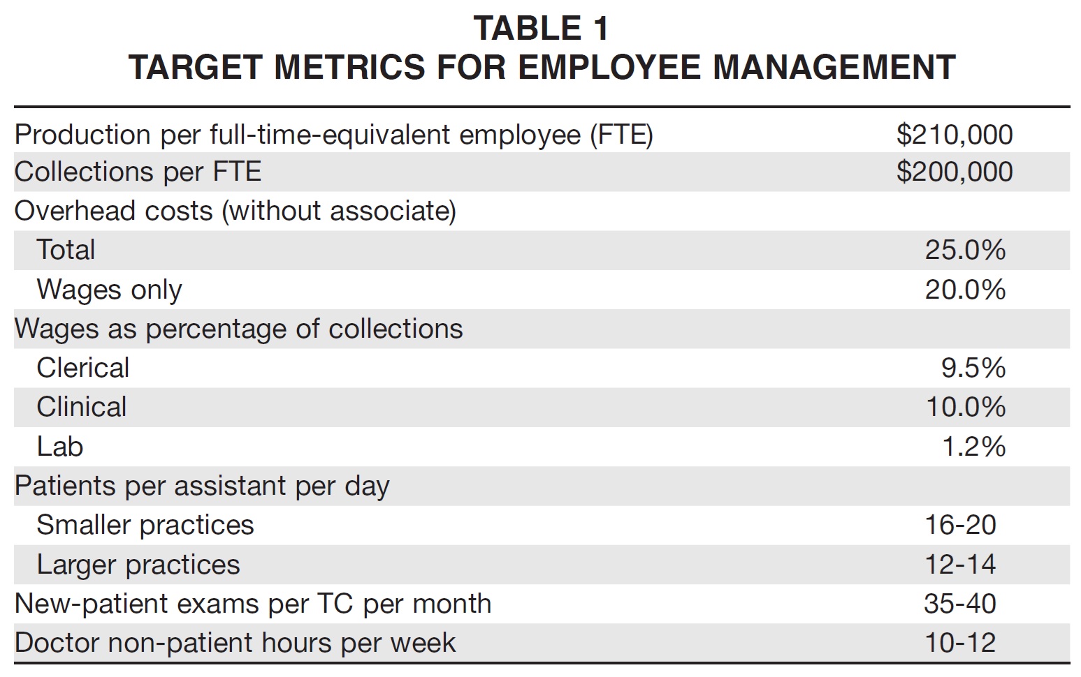 Both communication and financial metrics are vitally important for managing employees. The first metrics I examine are gross production per full-time-equivalent employee (FTE) and collections per FTE. "Full time" typically means 32-36 hours per week for a four-day-a-week office, or 40 hours per week for an office that is open more hours. The targets should be $210,000 in production per FTE and $200,000 in collections per FTE (Table 1).
