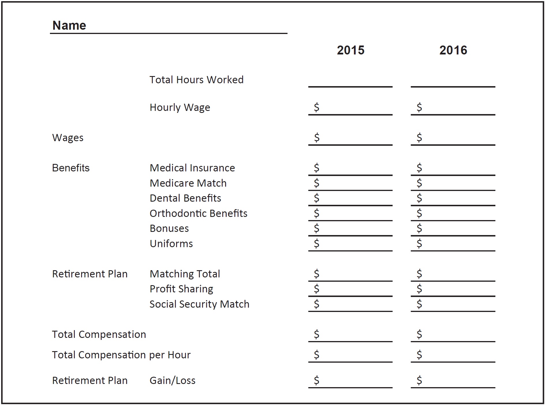 Wages include payment for all regular, overtime, vacation, holiday, and sick days. The benefits section includes matching Medicare payments, since Medicare is actually medical insurance for the employee's future. Retirement plan amounts do not include the employee's personal withholding contributions. If your office is generous with benefits, the impact will be seen in the Total Compensation per Hour. The final line on the worksheet shows the annual gain or loss in the value of your employee retirement plan; this is an opportunity to demonstrate how your long-term employees continue to benefit from all your years of contributions to their retirement accounts.