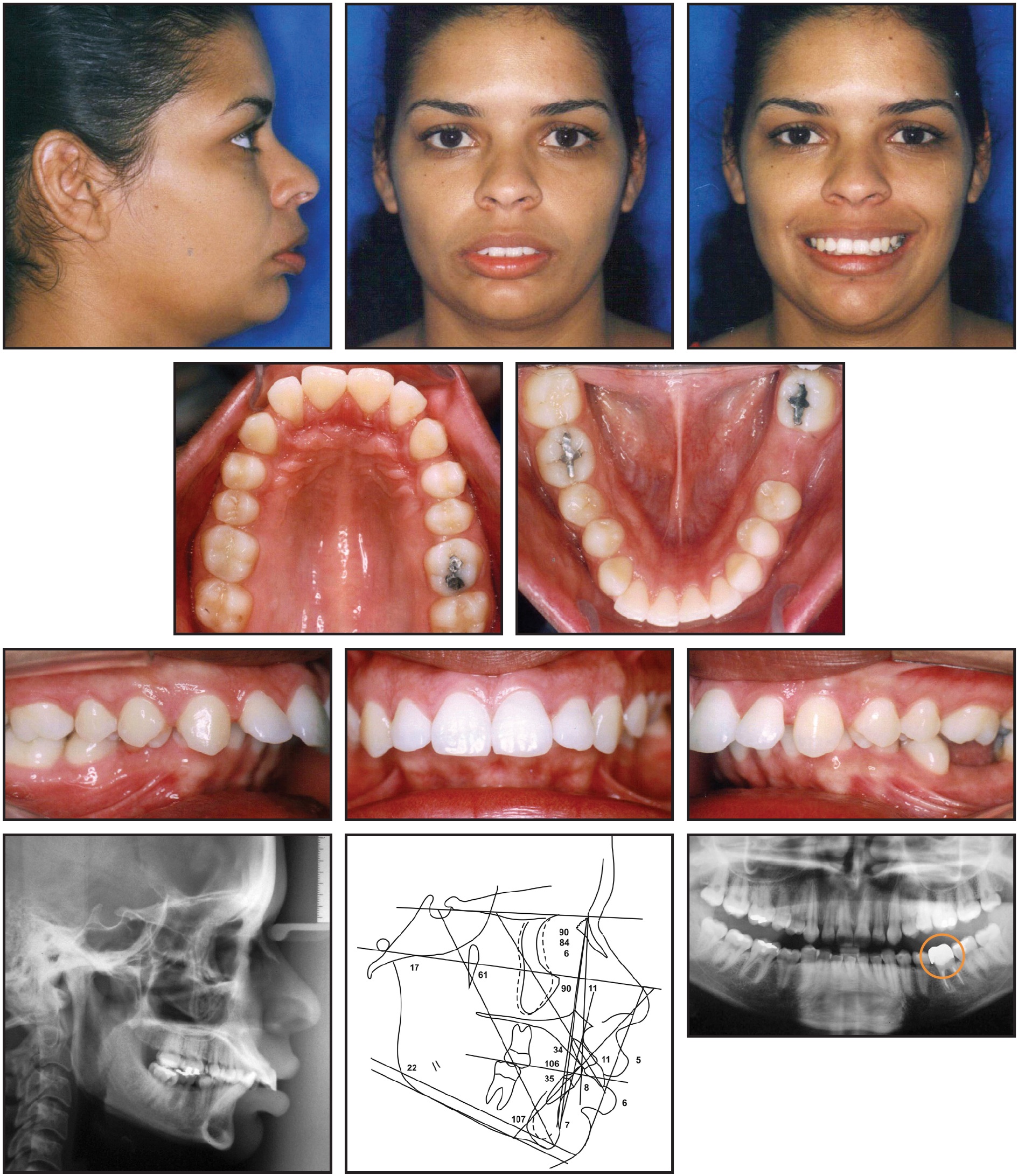 The panoramic radiograph indicated adequate levels of alveolar bone and the presence of all teeth, including the third molars. (Because the lower left first molar had a lesion in the region of the furcation, it was extracted before the initial photographs were taken.) Cephalometric analysis confirmed the Class II malocclusion (ANB = 6o, Wits appraisal = +5mm), as well as brachyfacial characteristics (SNGoGn = 22º and FMA = 17º). Functional analysis showed that centric relation was coincident with centric occlusion; there were no signs of TMD.