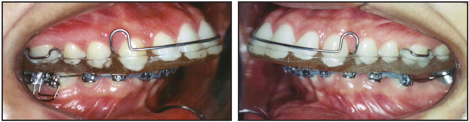 Another aspect of the treatment plan discussed with the patient was the full-time wear of a splint to open the bite until the mandibular curve of Spee had been corrected. Many devices have been developed to prevent contact of the upper teeth with lower brackets in patients with deep overbite, including fixed mandibular activators, fixed or removable anterior biteplanes, and lingual appliances incorporating the biteplane in the brackets.13,14 In our patient, the objective of constructing a splint with simultaneous bilateral contacts was to provide greater comfort during mastication.