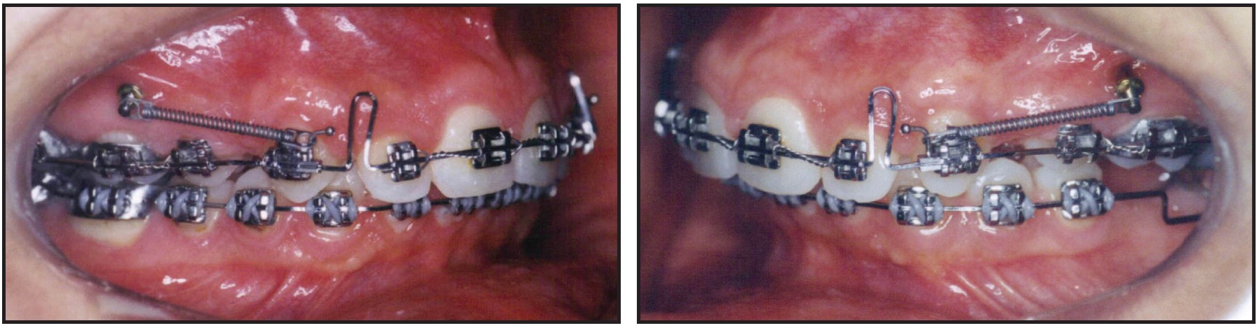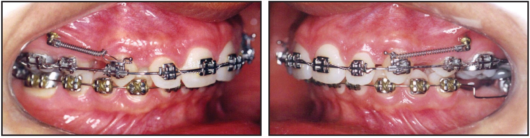 After nine months of treatment, the miniscrews*** were inserted, and the patient was referred for extraction of the first premolars. One week after the extractions, 100g nickel titanium closed-coil springs† were attached between the miniscrews and a crimpable hook positioned mesial to the canine brackets to move these teeth independently (Fig. 3).