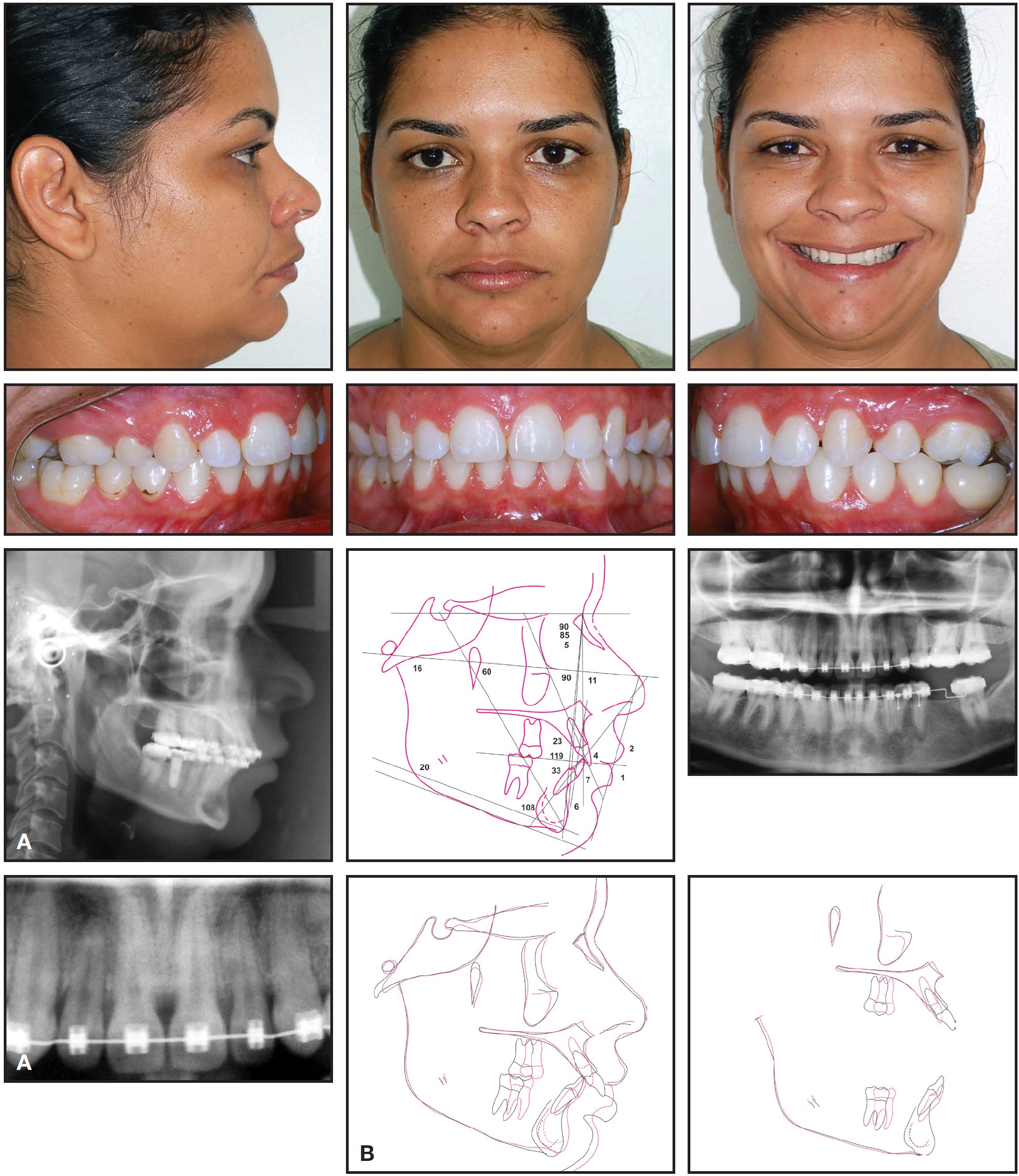 Cephalometric superimpositions showed that the SNA angle remained unchanged, even with the incisor retraction (Fig. 5B). There was a small counterclockwise mandibular rotation, as demonstrated by a reduction in the vertical dimension.