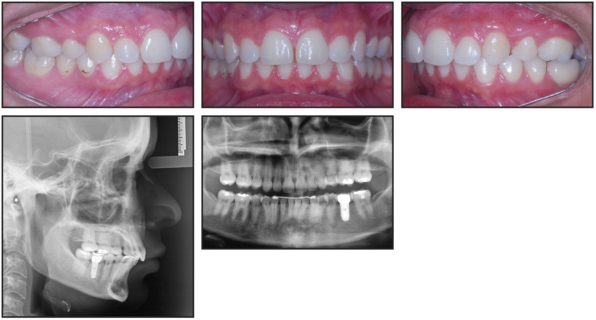 Sixteen months into treatment, the upper-incisor retraction had been completed, and a panoramic radiograph was obtained to check for root parallelism. An .019" x .025" stainless steel ideal archwire was bent to finish detailing of the occlusion. Six months before appliance removal, the patient was referred to a periodontist and a prosthodontist for an implant-supported restoration of the lower left first molar.