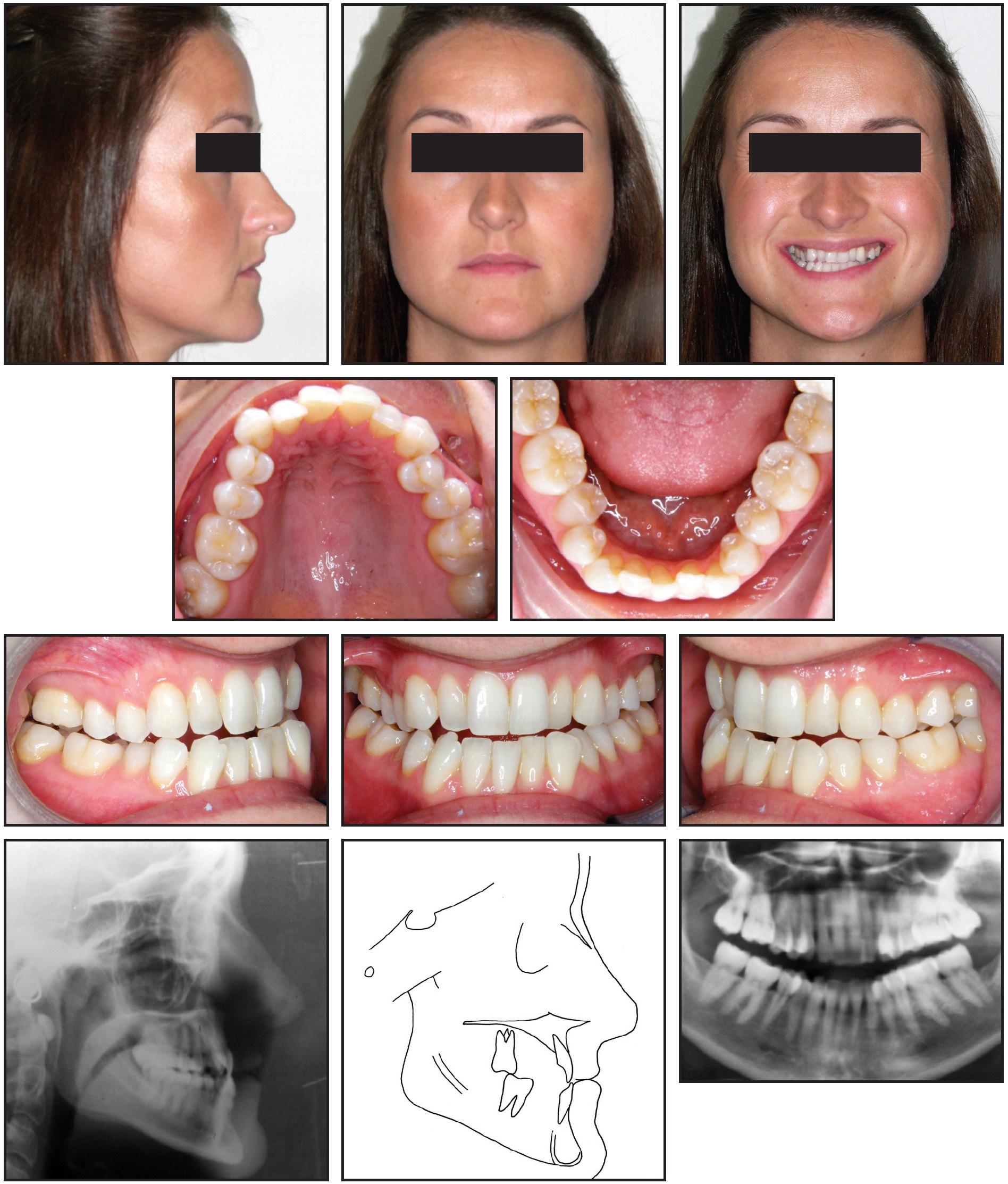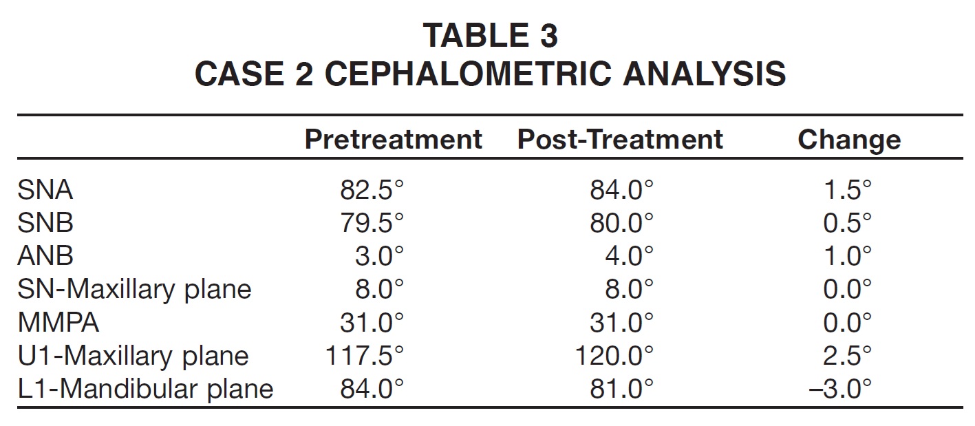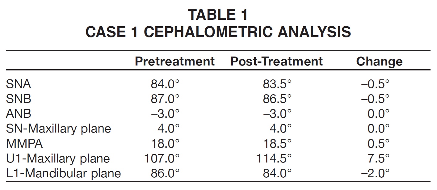The overjet was 1.5mm to the upper right central incisor, and the overbite was complete. The upper arch was moderately crowded, with a mesiolabially rotated left lateral incisor; the lower arch was mildly crowded, with proclined incisors and a left first premolar in buccal crossbite. The lower posterior dentition had been extensively restored. The pretreatment panoramic x-ray confirmed the presence of all permanent teeth, with normal alveolar bone levels and root morphology. Cephalometric analysis confirmed the Class I skeletal base and slightly proclined upper incisors (Table 3).