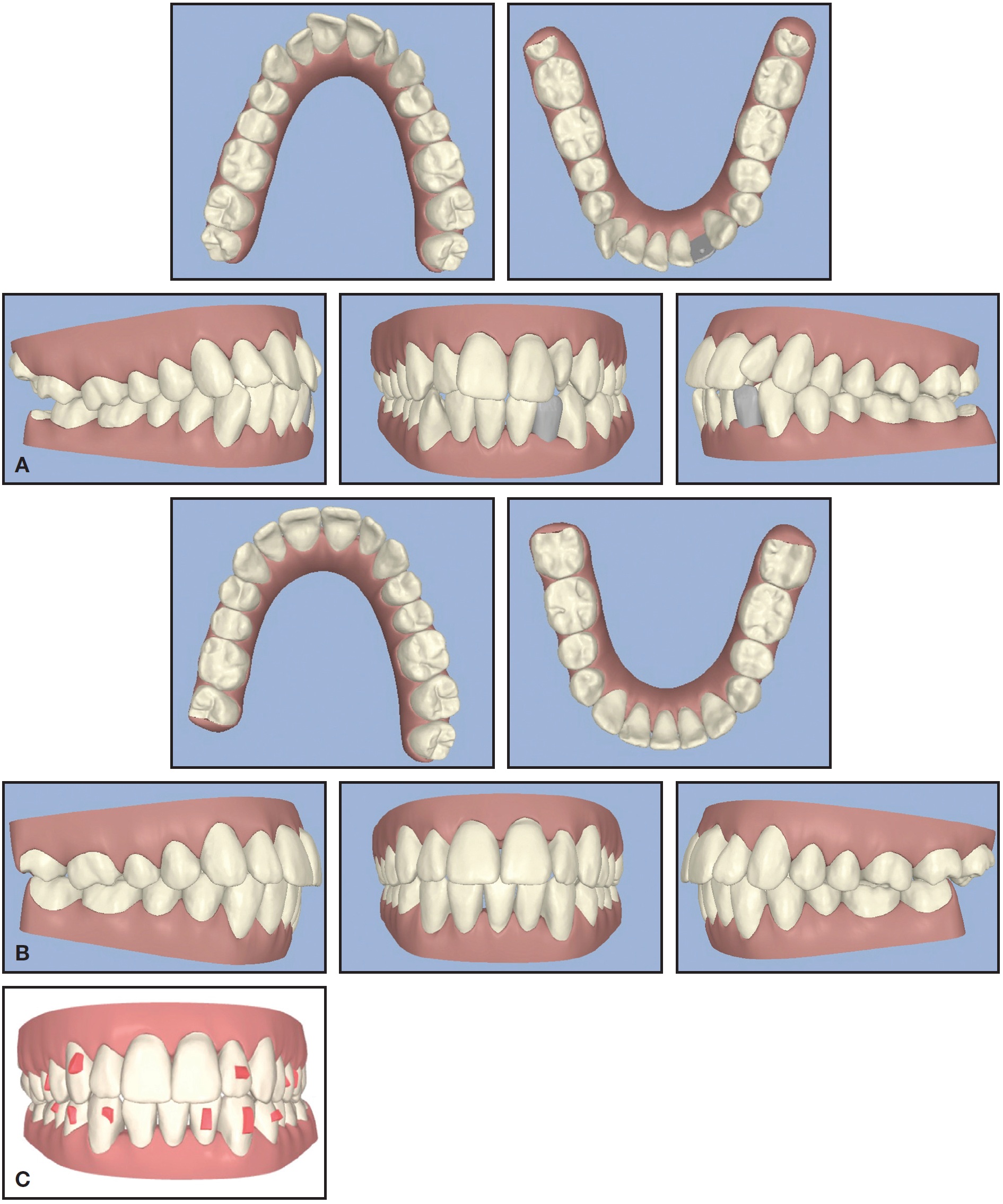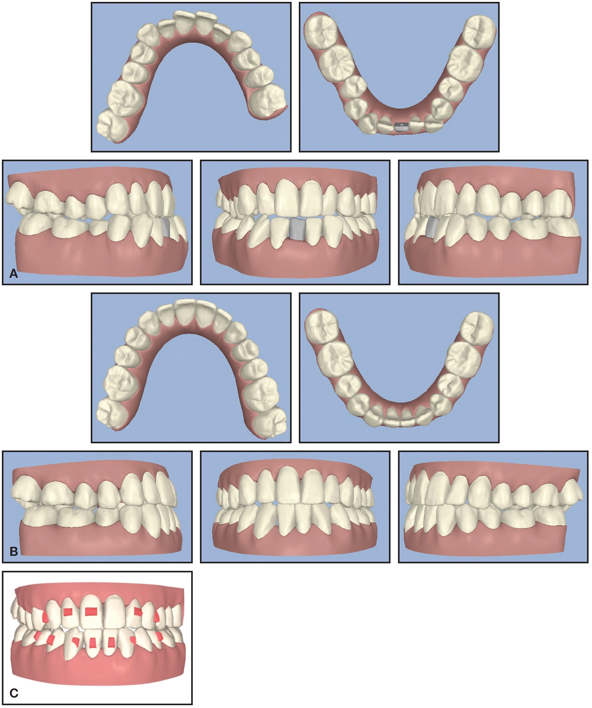 Fig. 8 Case 2. A. Pretreatment ClinCheck. B. Projected post-treatment ClinCheck. C. Attachment ClinCheck.