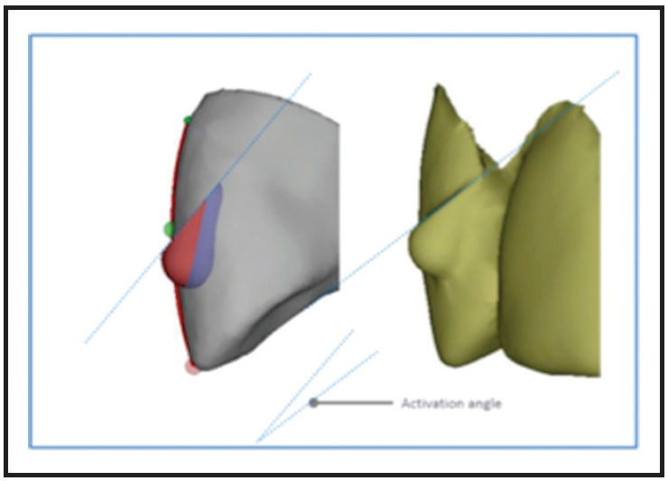 In this case, to promote space closure and prevent tipping, vertical rectangular attachments (5mm high, 2mm wide, 1mm thick) were bonded to the lower left central and right lateral incisors, and optimized rotation attachments were bonded to the upper canines (Fig. 2C). Optimized rotation attachments were placed on the lower canines to provide a more acute activation angle between the aligner and the surface area of the attachments (Fig. 3), with 27.5º of rotation programmed for the right canine and 24.6º for the left canine. Because the upper right central incisor, upper right lateral incisors, and upper left lateral incisor were lingually tipped compared to the upper left central incisor, optimized extrusion attachments were bonded to these teeth for .5mm, .9mm, and 1.0mm of extrusion, respectively. This ClinCheck programming would help close the anterior open bite and improve the smile line and incisor display. Beveled vertical rectangular attachments (5mm high, 2mm wide, 1.25mm thick) were bonded to the lower right first premolar, lower right second premolar, and lower left second premolar to improve mechanical retention while derotating the premolars. Power ridges were placed on the upper anterior teeth to allow lingual (palatal) root torque of the right lateral incisor (13º), left central incisor (7º), and left lateral incisor (16º). (A maximum 1º of root torque can be achieved with each successive aligner.)