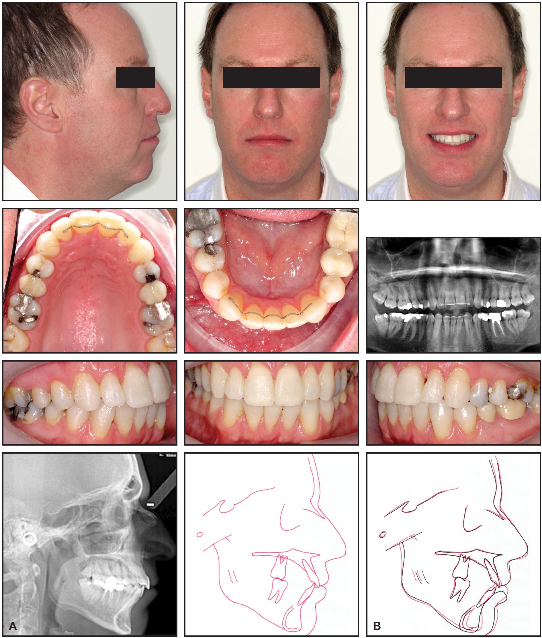 Fig. 9 Case 2. A. Patient after 17 months of treatment. B. Superimposition of cephalometric tracings.