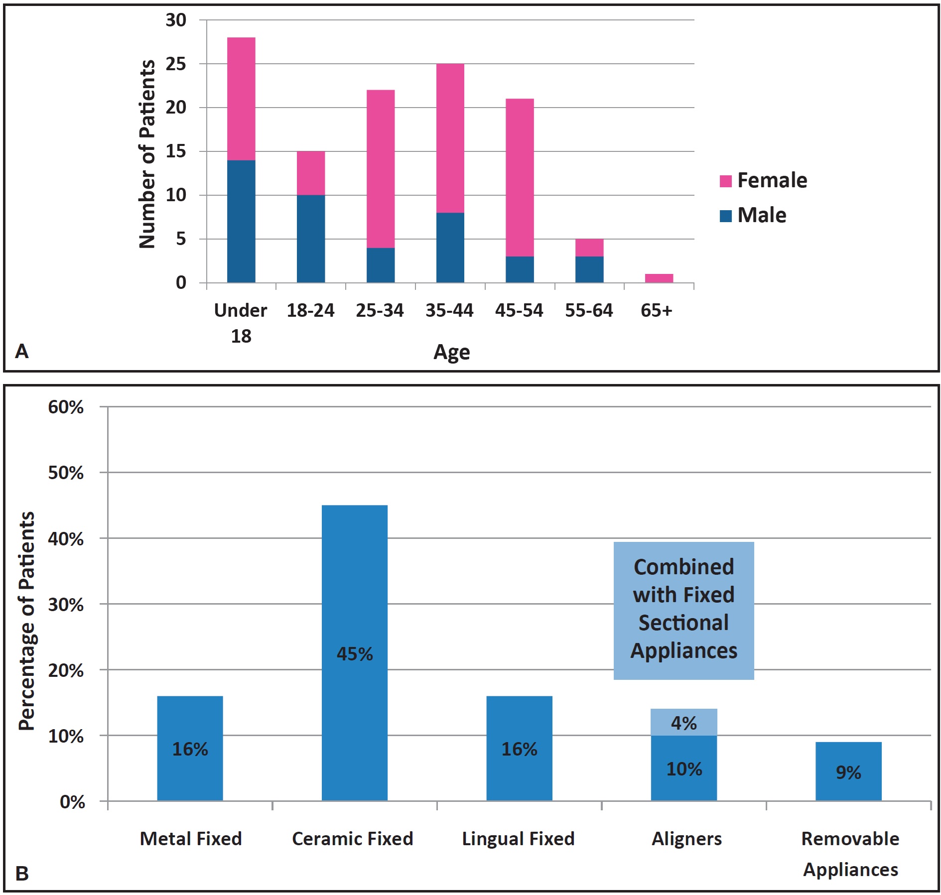 1. Age and sex: The 117 patients accepting AcceleDent had a mean starting age of 31 years, six months (Fig. 1A). Sixty-four percent of the patients were female; 76% were adults.
