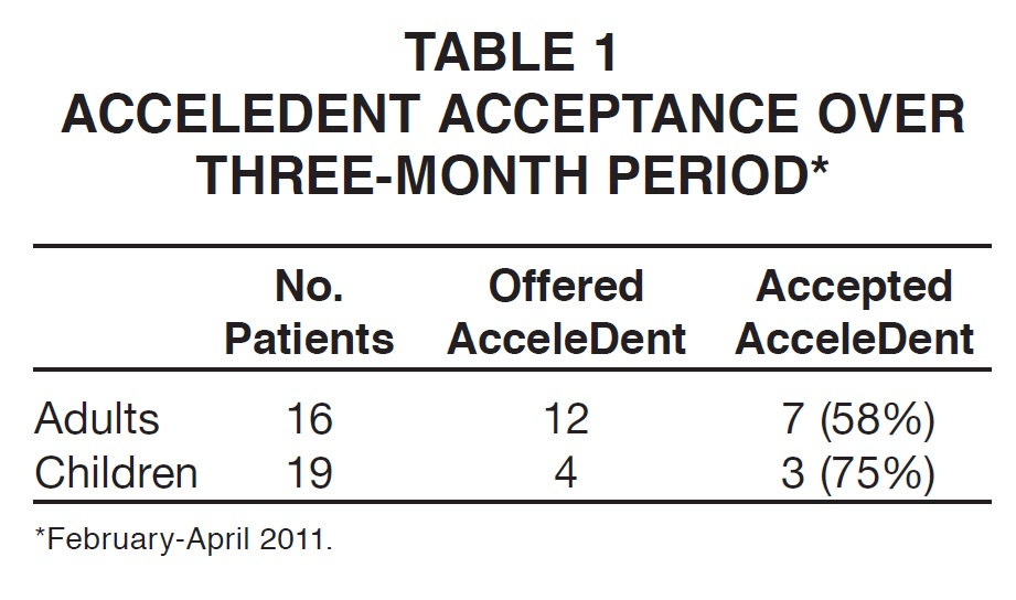 3. Acceptance rates: The acceptance of AcceleDent when recommended with orthodontic treatment was documented over a three-month period (February-April 2011). Of the 35 patients who accepted treatment during that time, AcceleDent was offered to 16 patients (45%) and accepted by 10, resulting in an overall 63% acceptance rate. Because of the selection criteria outlined above, AcceleDent was offered to a higher percentage of adults than of children (Table 1).