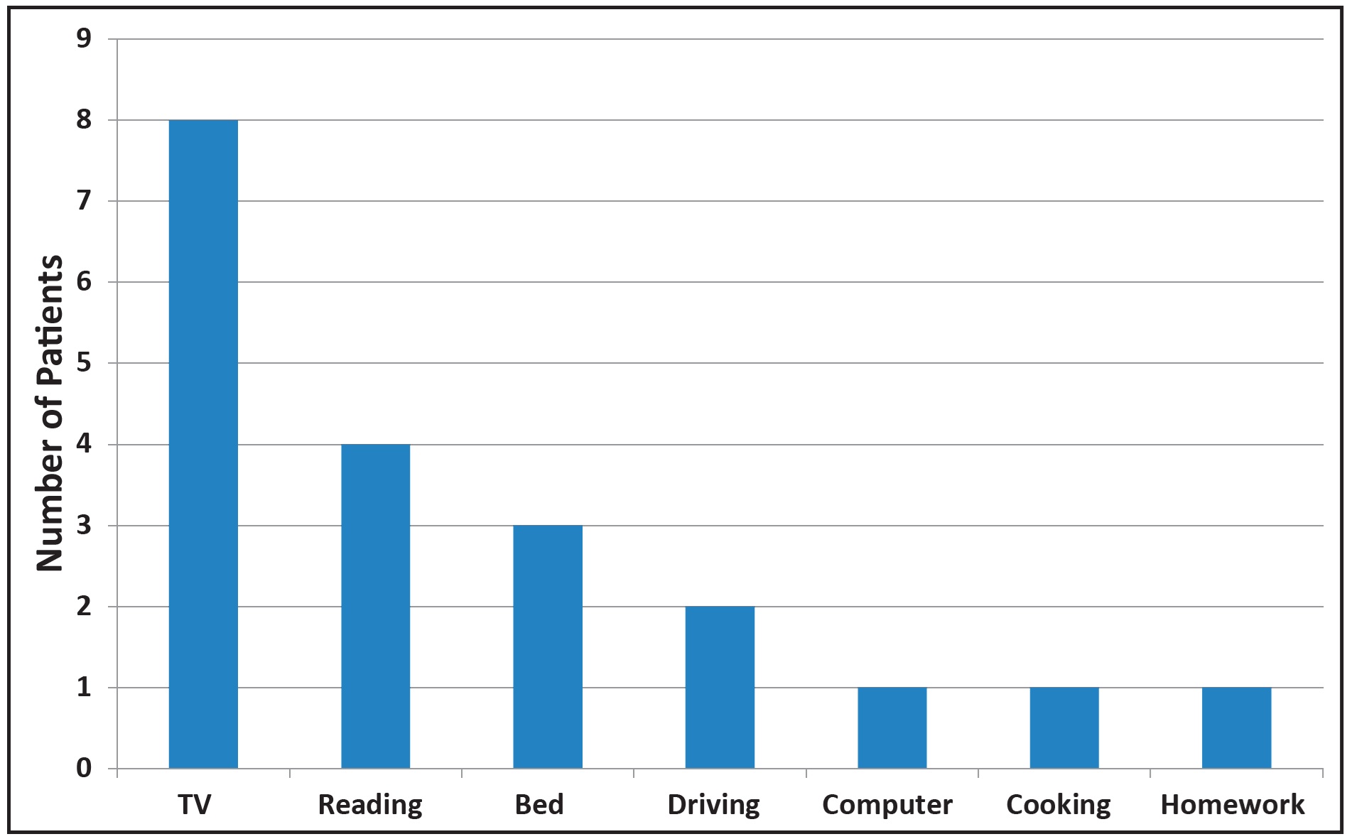 4. Preferred place of use: The most popular place (47%) for using AcceleDent was while watching TV (Fig. 2). Although two respondents said they used AcceleDent while driving, the practice now recommends against using AcceleDent while driving because it may cause a distraction.