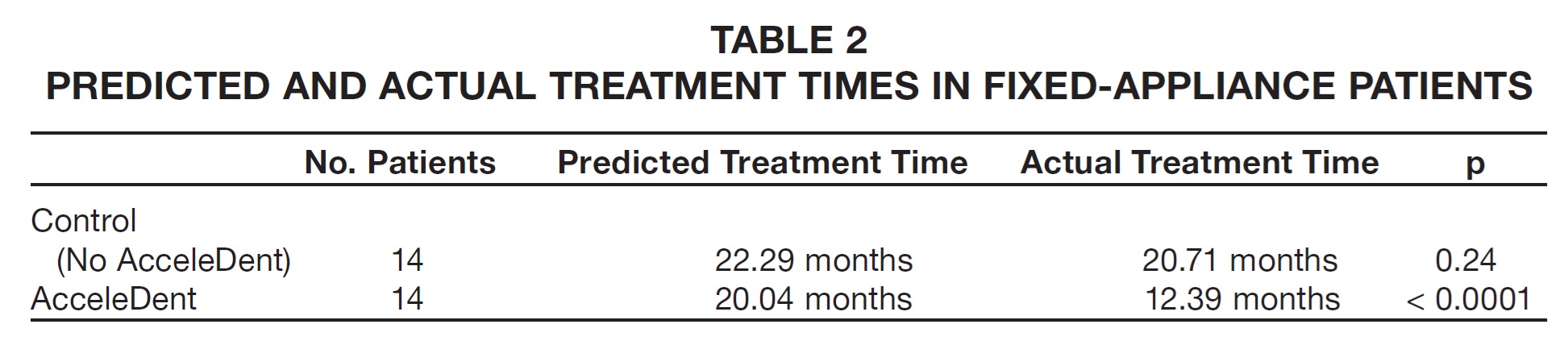 Reduction in treatment time: Although the matched sample of fixed-appliance cases was relatively small (N = 14), the average savings of more than six months over a 20-month estimated treatment time was statistically significant (p < .0001).