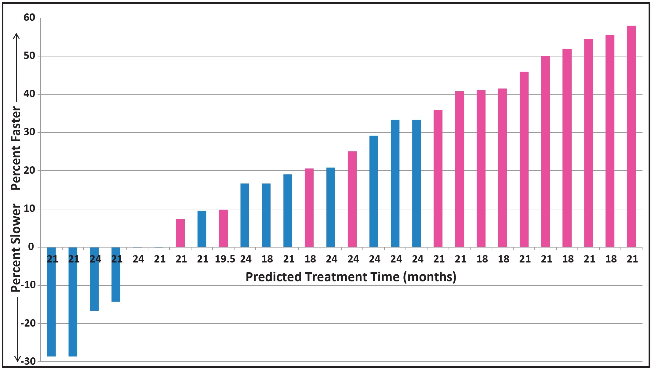 Fig. 3 Slower or faster than predicted treatment times for AcceleDent group (pink, N = 14) compared to control group without AcceleDent (blue, N = 14).