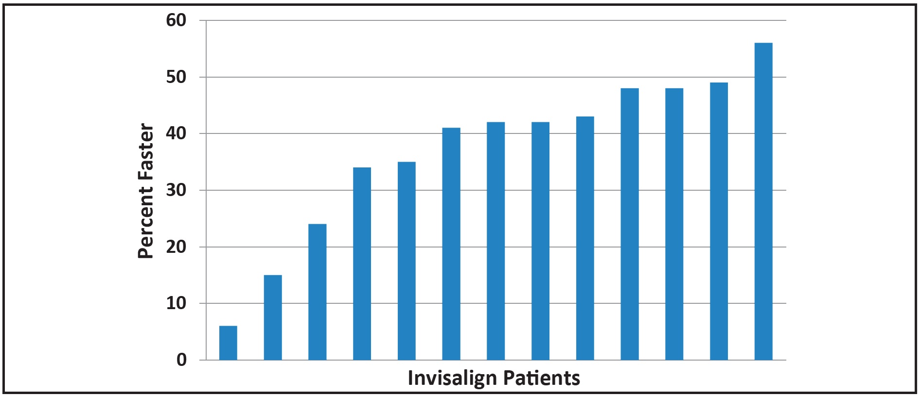 For each of the 13 completed aligner patients who chose to use AcceleDent between May 2010 and May 2014, the required number of aligners was determined, and the treatment time was estimated by multiplying that number by the customary two weeks per aligner. This is a conservative estimate because patients will sometimes use the same aligners longer than two weeks (for example, when on vacation), and appointments may not coincide exactly with aligner change dates, further lengthening treatment. Patients using PF were asked to change their aligners as they became passive, which they reported to be seven to 10 days. Treatment time was an average 37.2% faster than the conservative estimate for each case, with a range of 5-55% faster (Fig. 4).