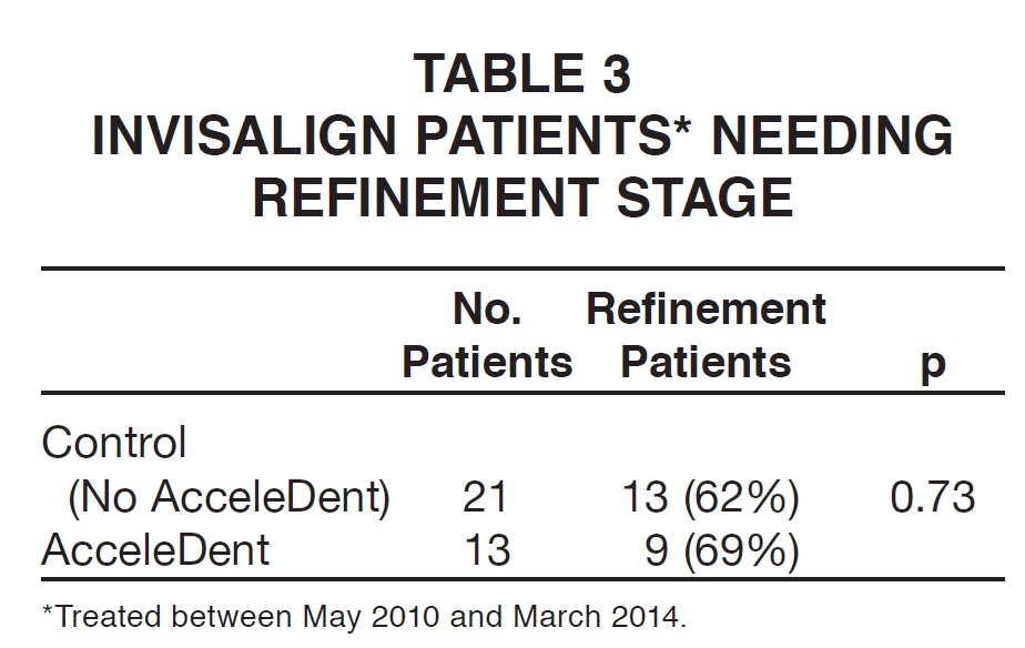 Need for refinement aligners: A number of clinicians have reported in personal communications that their patients track better using AcceleDent, so that fewer case refinements are needed. We did not find that to be true in our sample. The practice asks every aligner patient, with or without PF, to bite for 10 minutes per day on a small flexible block (chewie) for the first day or two each time the aligners are changed. Clinicians who do not use this technique may see more positive effects from biting on the AcceleDent mouthpiece.