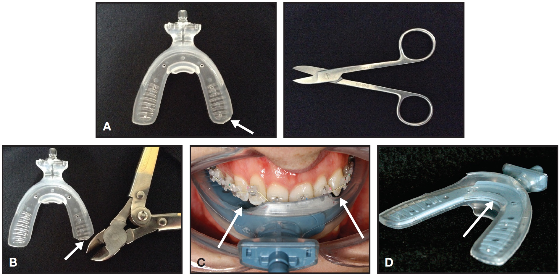 Fig. 5 Trimming of AcceleDent mouthpiece as required in some cases. A. Corner can be rounded off using non-serrated scissor. B. Solid inner core can be shortened with Mauns wire cutter for young patient. C. Buccal flange trimmed to avoid impeding tooth movement. D. Palatal flange trimmed to accommodate biteplanes on central incisors.