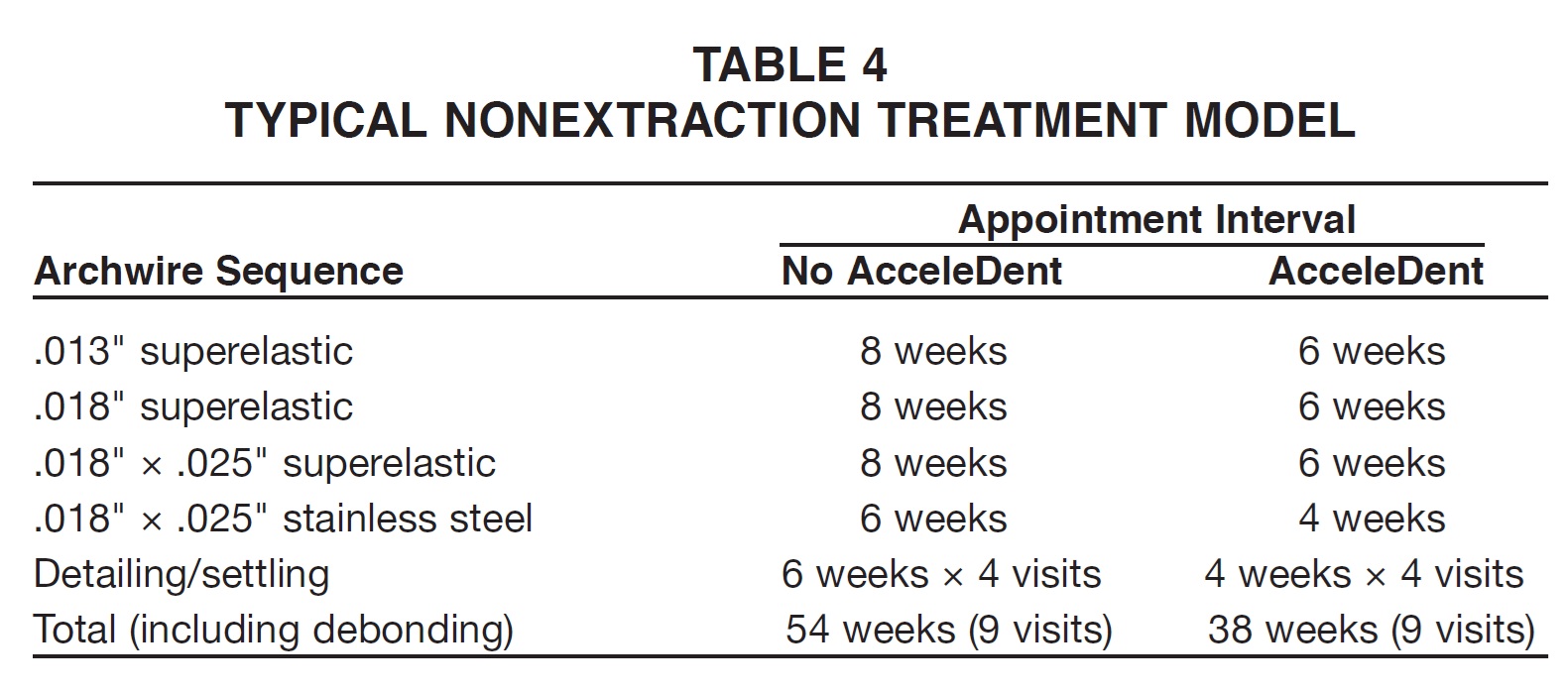 In fixed-appliance cases, the faster tooth movement achieved with AcceleDent will shorten the interval between visits for leveling and alignment, as well as in the detailing phase. During space closure, appointments can be maintained at normal intervals as the mechanics continue to be active. Table 4 shows a model for a simple 12 1/2-month leveling and alignment case, assuming full cooperation, good attendance, and no breakages. In this example, a typical 54-week case is reduced to 38 weeks with no difference in the total number of visits.
