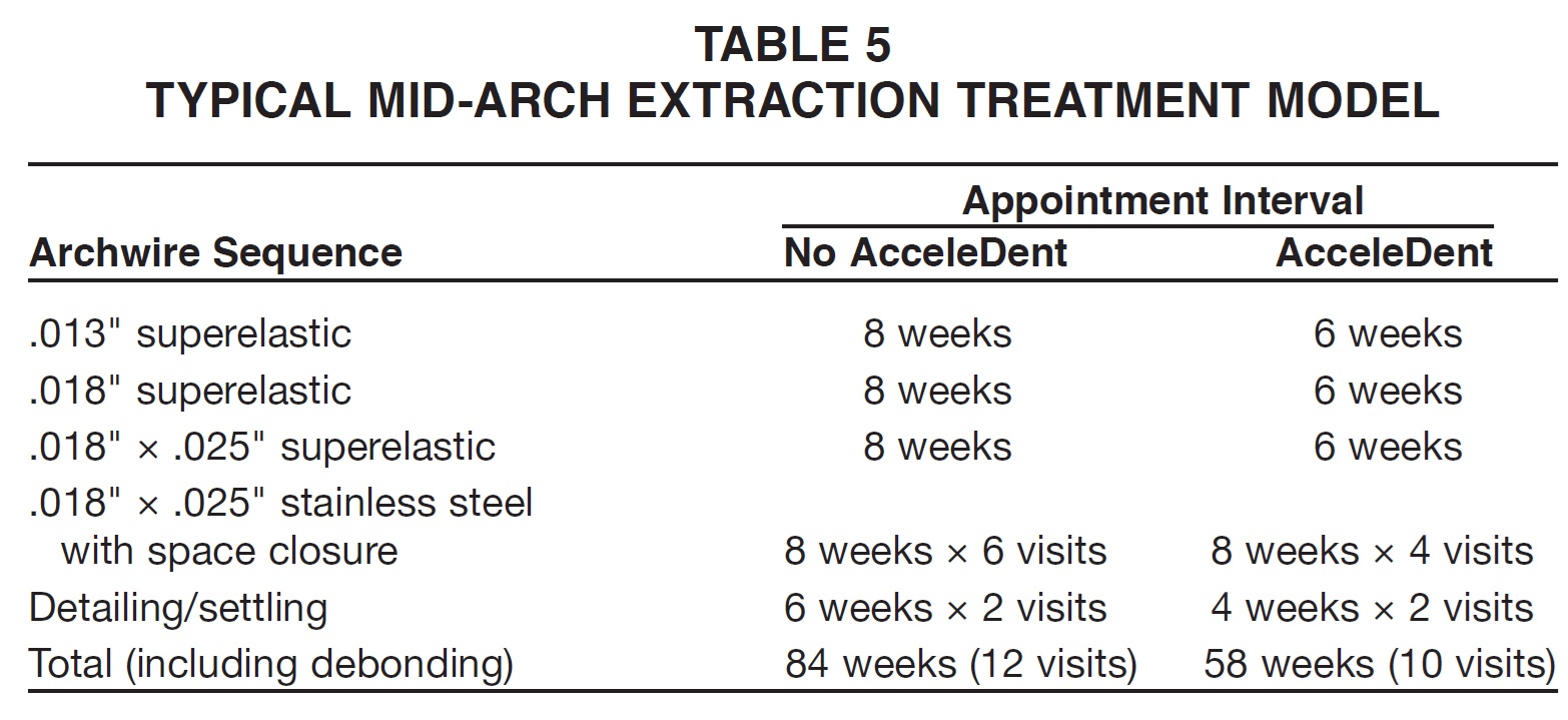 Table 5 shows a more complex model that would normally take 19 1/2 months (84 weeks) to complete. With AcceleDent, this is reduced to 58 weeks (13½ months), with two fewer visits needed (10 instead of 12), thus saving chairtime. These examples reflect the average time savings in our practice.