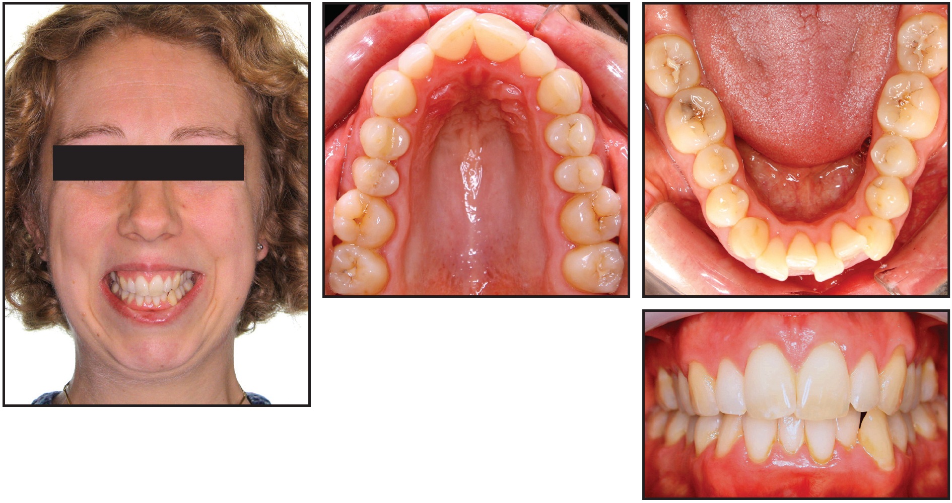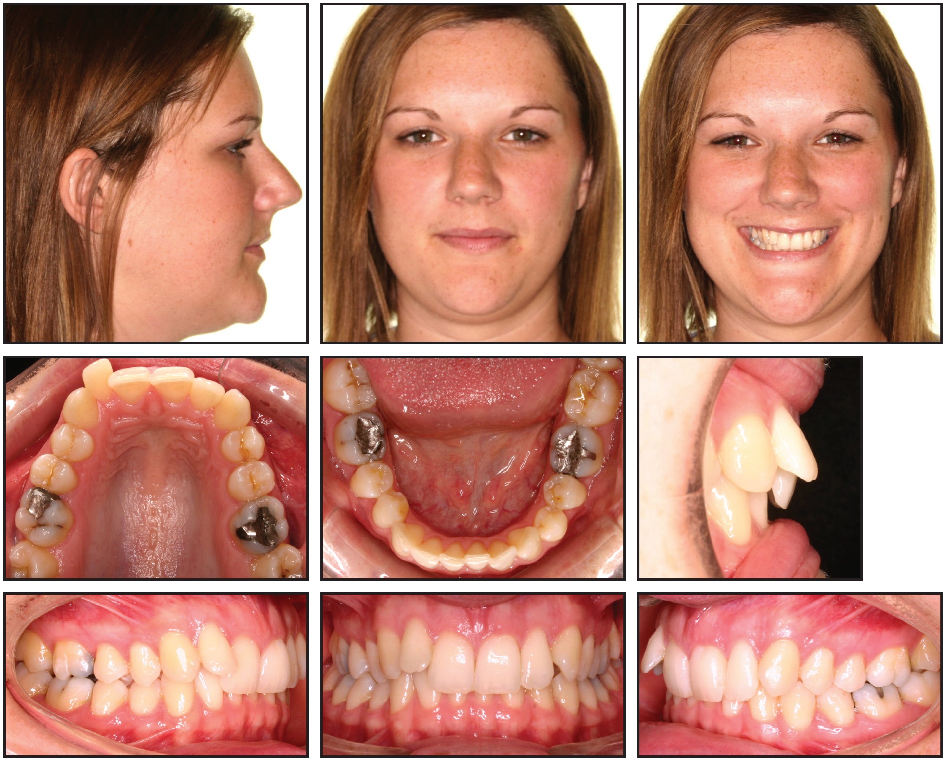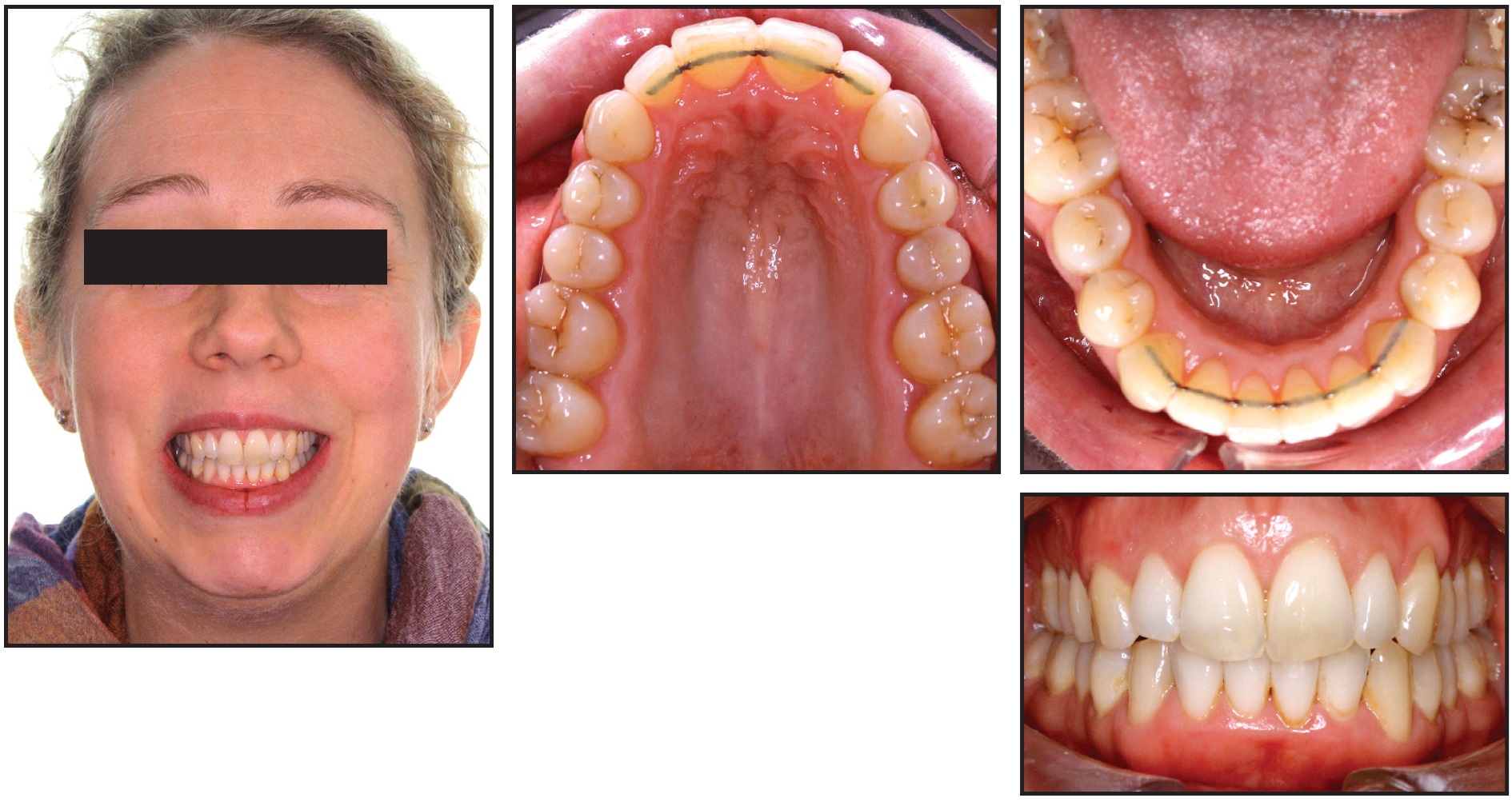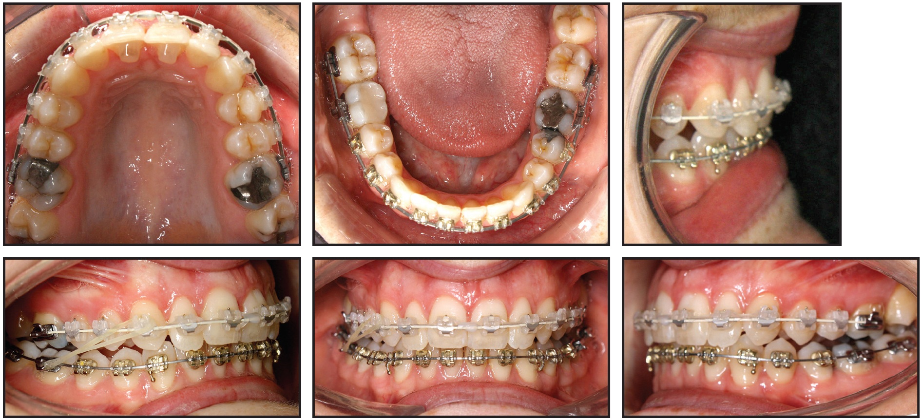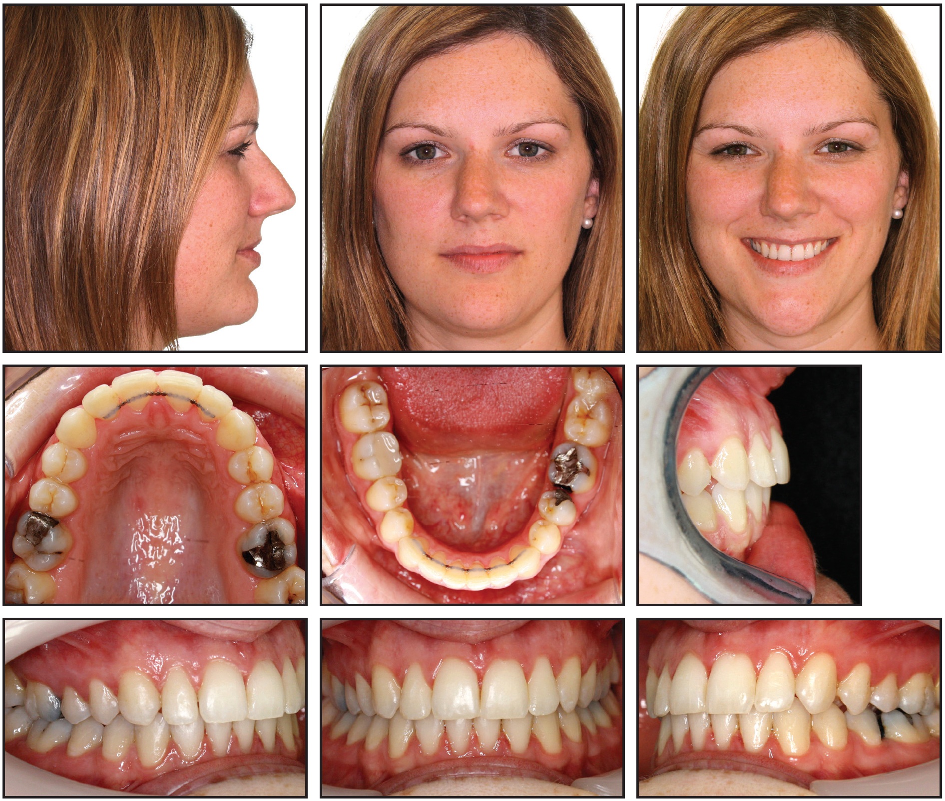 Case 1 was a 27-year-old female who presented 13½ months before her wedding with a moderate Class II, division 2 relationship, mild crowding in the lower arch, and moderate crowding in the upper right quadrant (Fig. 6).