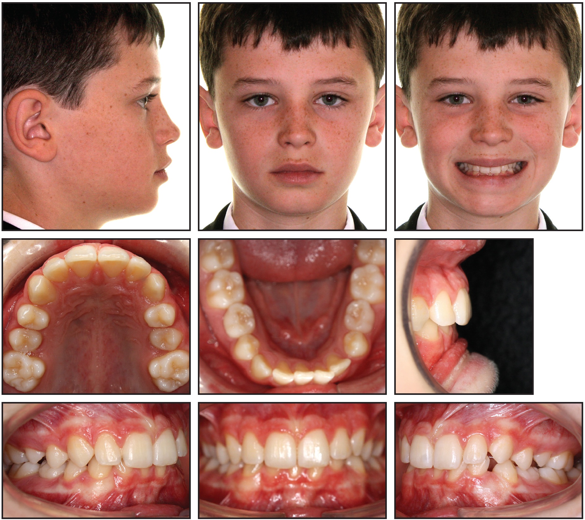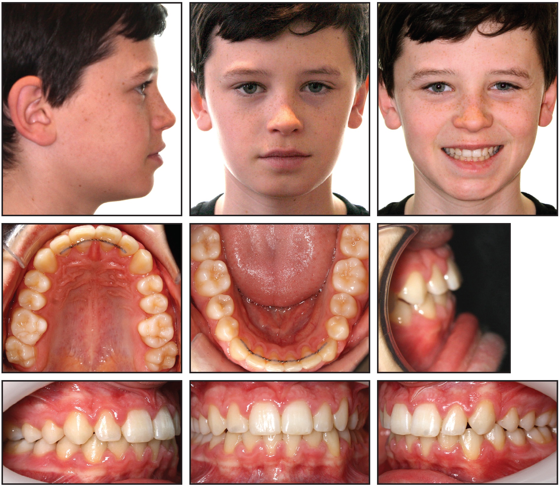 Fig. 9 Case 2. 13-year-old male patient with deep overbite, bimaxillary retroclination, reduced upper-incisor display, and lack of space for lower left canine before treatment. Estimated treatment time: 24 months.
