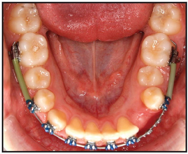 Fig. 10 Case 2. Space creation for lower left canine after two and a half months of lower fixed-appliance wear.